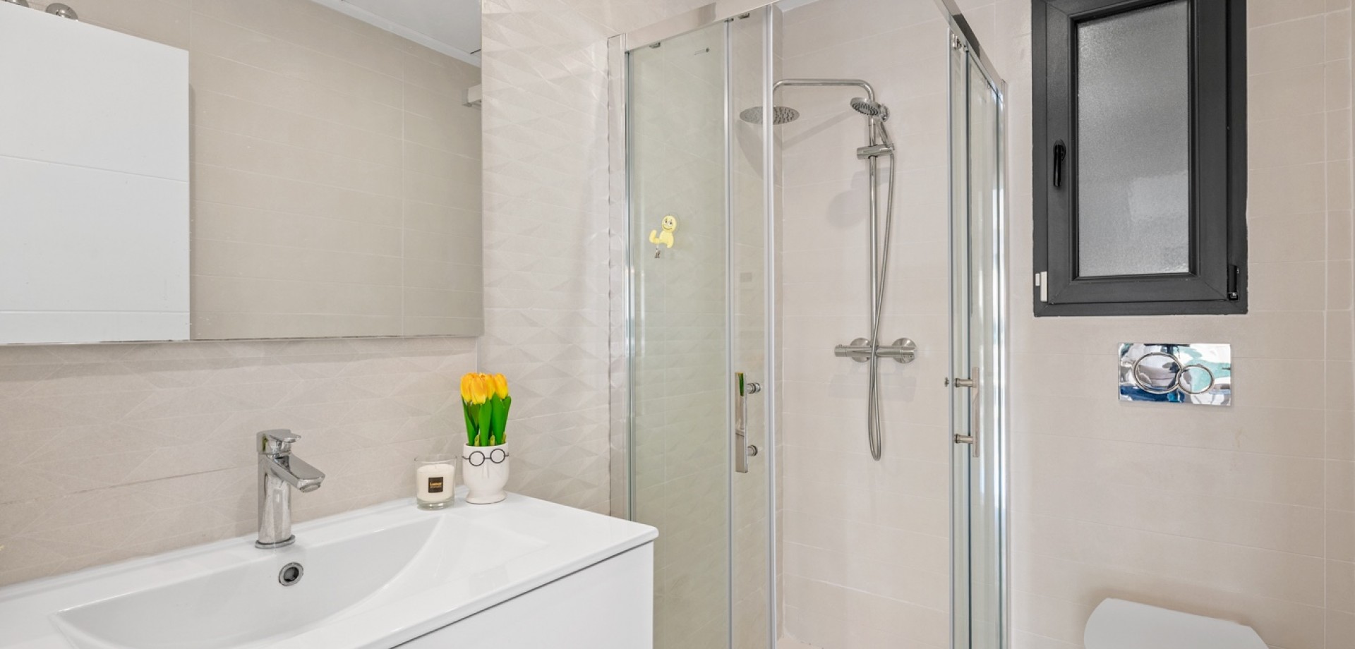 Op de eerste verdieping bevinden zich twee ruime tweepersoonsslaapkamers, beide met een eigen badkamer (en-suite). De hoofdslaapkamer heeft toegang tot een privéterras, en vanaf deze verdieping heeft u ook toegang tot het grote dakterras.