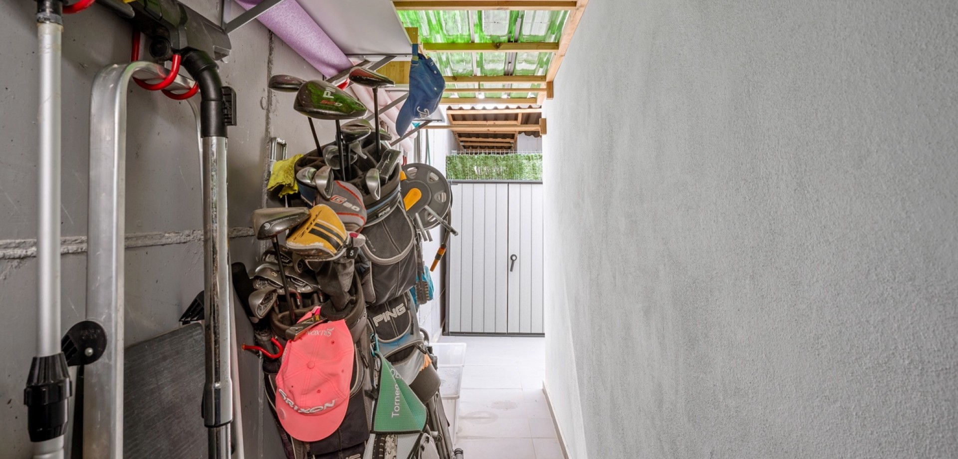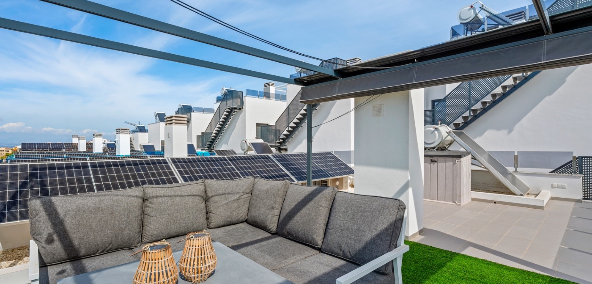 Naast de tuin biedt de villa een terras op de eerste verdieping en een ruim dakterras met uitzicht op de bergen, ideaal om te ontspannen of gasten te ontvangen. Het terras bestaat uit zowel betegelde delen als kunstgras, en beschikt over een grote zonwering voor schaduw.