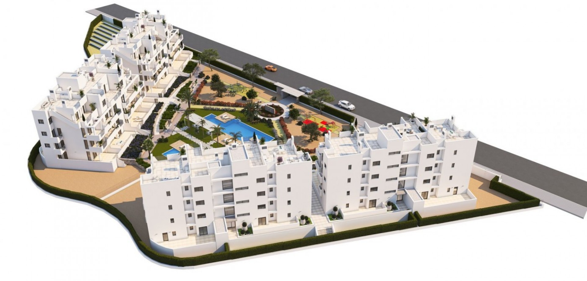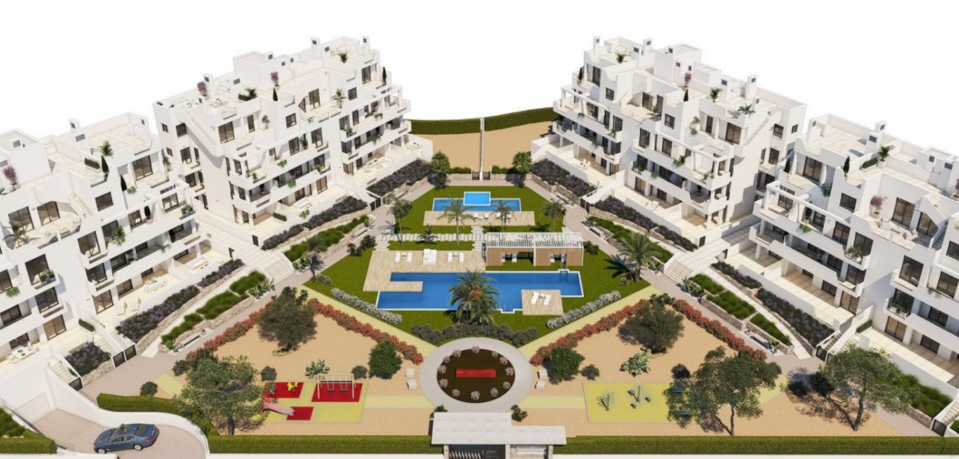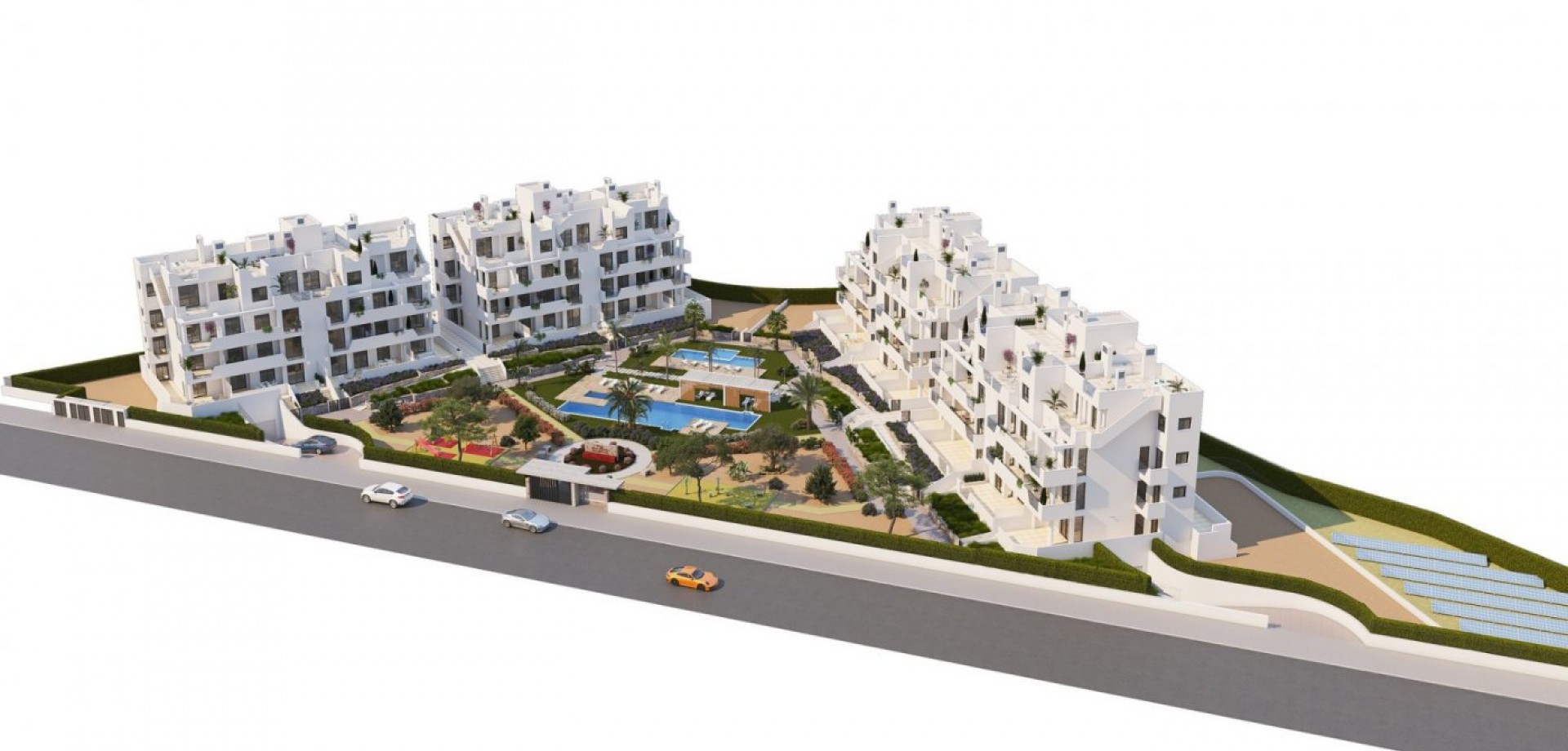 NIEUWBOUW RESIDENTIEEL IN PRIVE-GATED RESORT IN DE PROVINCIE MURCIA Nieuwbouw wooncomplex heeft 60 appartementen verdeeld over 4 blokken met terrassen voor de begane grond, eerste en tweede verdieping, gemeenschappelijk zwembad, verwarmd zwembad en solarium met zomerkeuken op de penthouses, om alle uren van de zon te genieten elke dag van het jaar. De woningen hebben 2 slaapkamers en 2 badkamers, evenals een parkeerplaats en berging in de kelder. Deze woningen zijn ontworpen met een eigentijdse stijl en open gepland concept, bestaande uit een volledig uitgeruste keuken en woon-eetkamer. De woningen zullen voldoen aan de hoogste normen en zijn inclusief: Keuken volledig ingericht en uitgerust met oven en magnetron in kolom, geïntegreerde koelkast en vaatwasser, inductie kookplaat en afzuigkap. LED-verlichting: binnen in de woning (eetkamer, keuken, gangen en badkamers), en ook in de buitenruimtes. Beklede kasten met laden. Gemotoriseerde rolluiken in de slaapkamers. Verwarmde vloeren in badkamers. Volledig ingerichte badkamers met toilet, badmeubel, spiegel, douche met regeneffect en schermpanelen. Pre-installatie voor airconditioning via leidingen. Pre-installatie van oplaadpunt voor elektrische voertuigen. Solarium met zomerkeuken, met pre-installatie voor elektrische apparaten. Gemeenschappelijk zwembad. Verwarmd zwembad. Parkeerplaats en berging in de kelder. Gelegen in een prive-gated resort, met een hoofdingang en 24-uurs beveiliging. Het resort is ontworpen rond een indrukwekkende 126.000 m2 groen gebied. Het omvat wandel-en fietspaden, sportfaciliteiten, paddle-en tennisbanen, een mini-golfbaan, tuinen, honden parken, recreatiegebieden, clubhuis.... Ook in het centrale gebied is het juweel van het resort, een kristalhelder kunstmatig meer van bijna 17.000 m2 wateroppervlak, omgeven door witte zandstranden en palmbomen, die een stukje van het Caribisch gebied naar de regio Murcia brengen. Er zijn 2 eilanden in het meer, een ervan heeft zijn eigen bar, er zijn ook "strand Chiringuitos" verspreid over het meer. Het resort is strategisch gelegen op minder dan 4 km van het strand en de stad Los Alcázares, waar u verschillende watersporten kunt beoefenen, omringd door verschillende golfbanen en de stad Cartagena op minder dan 15 minuten met de auto en 22 km van de luchthaven van Murcia, waardoor u een breed cultureel, gastronomisch en sportief aanbod binnen handbereik heeft.