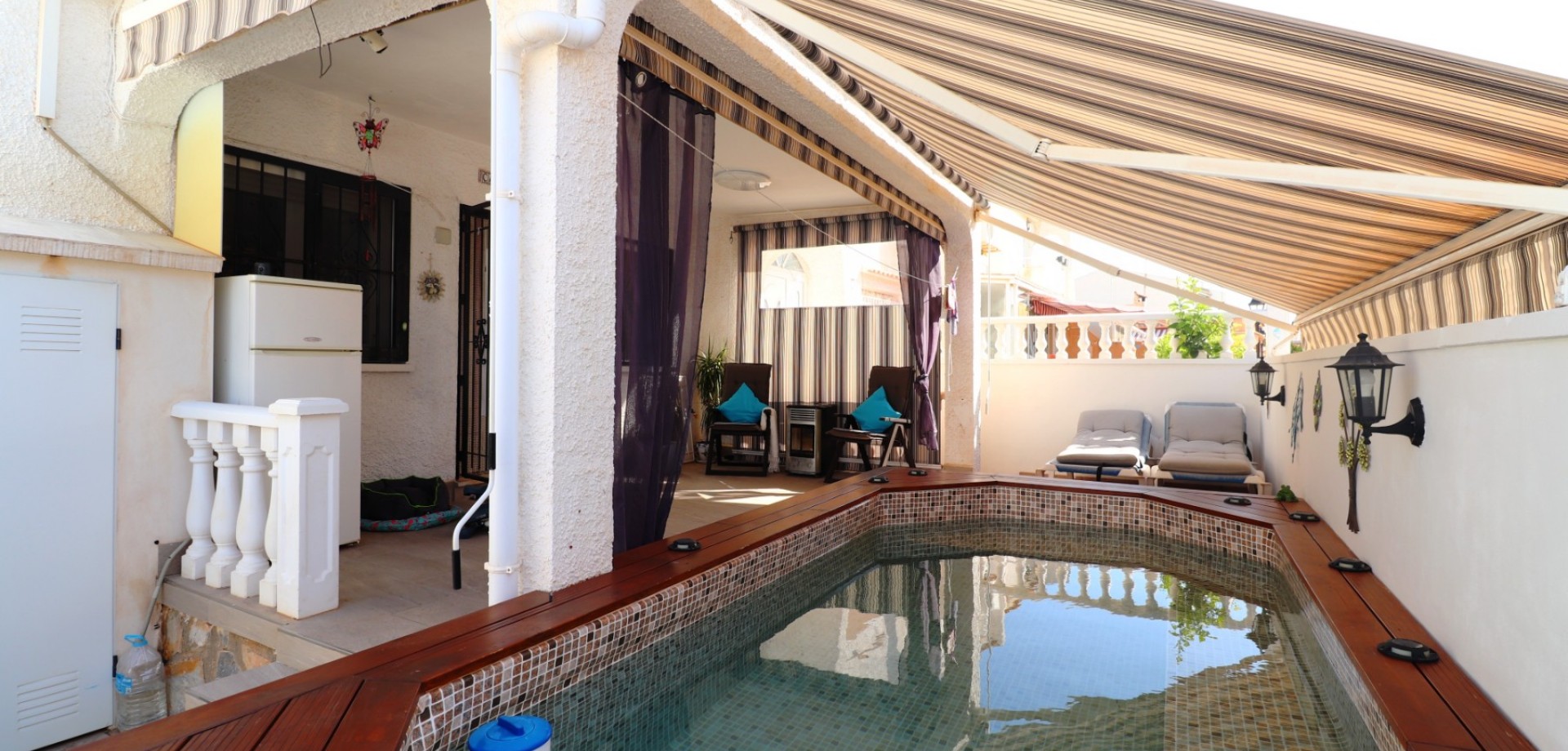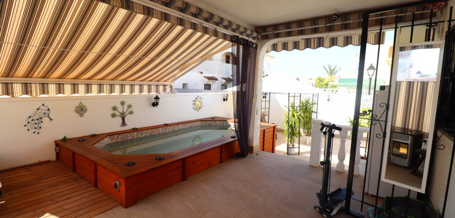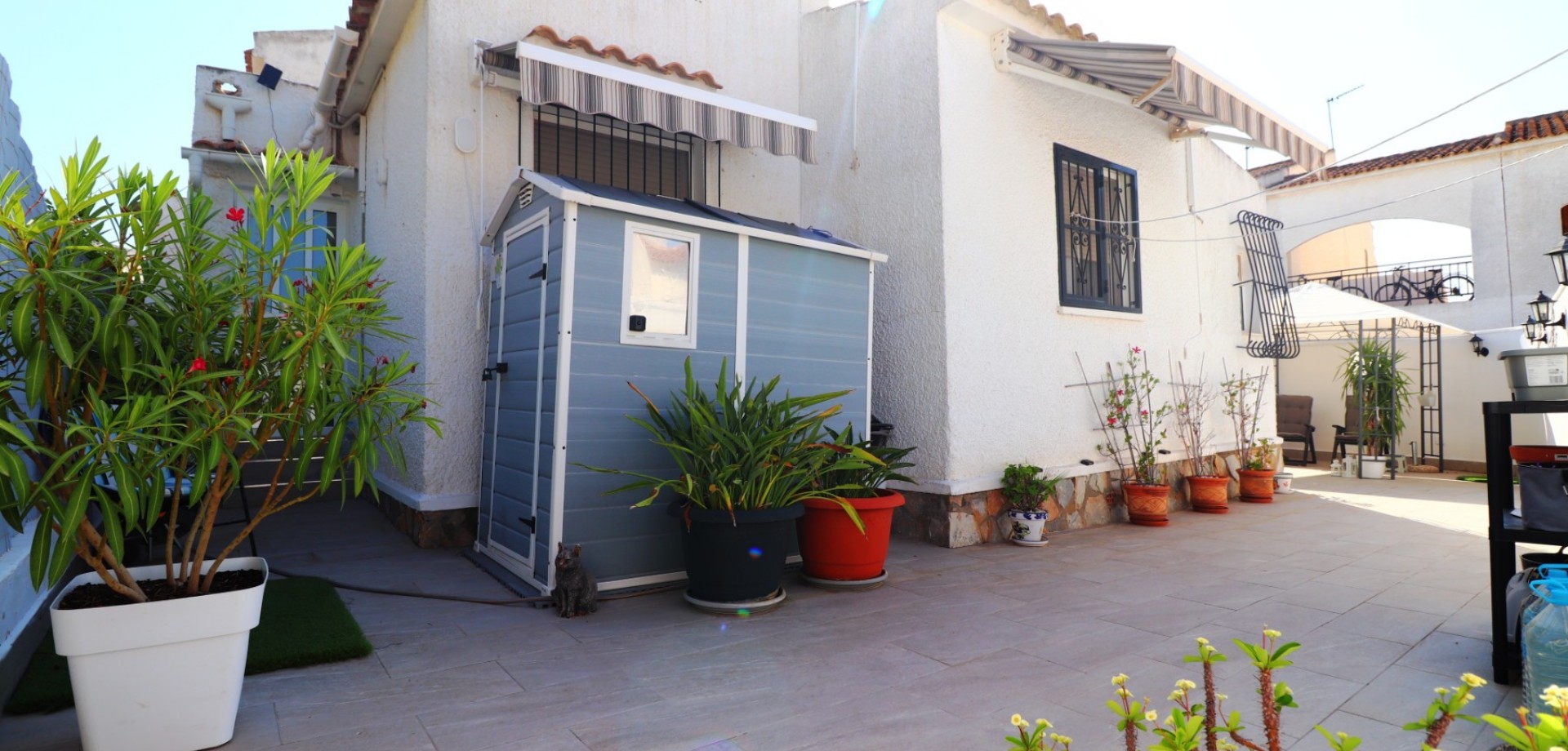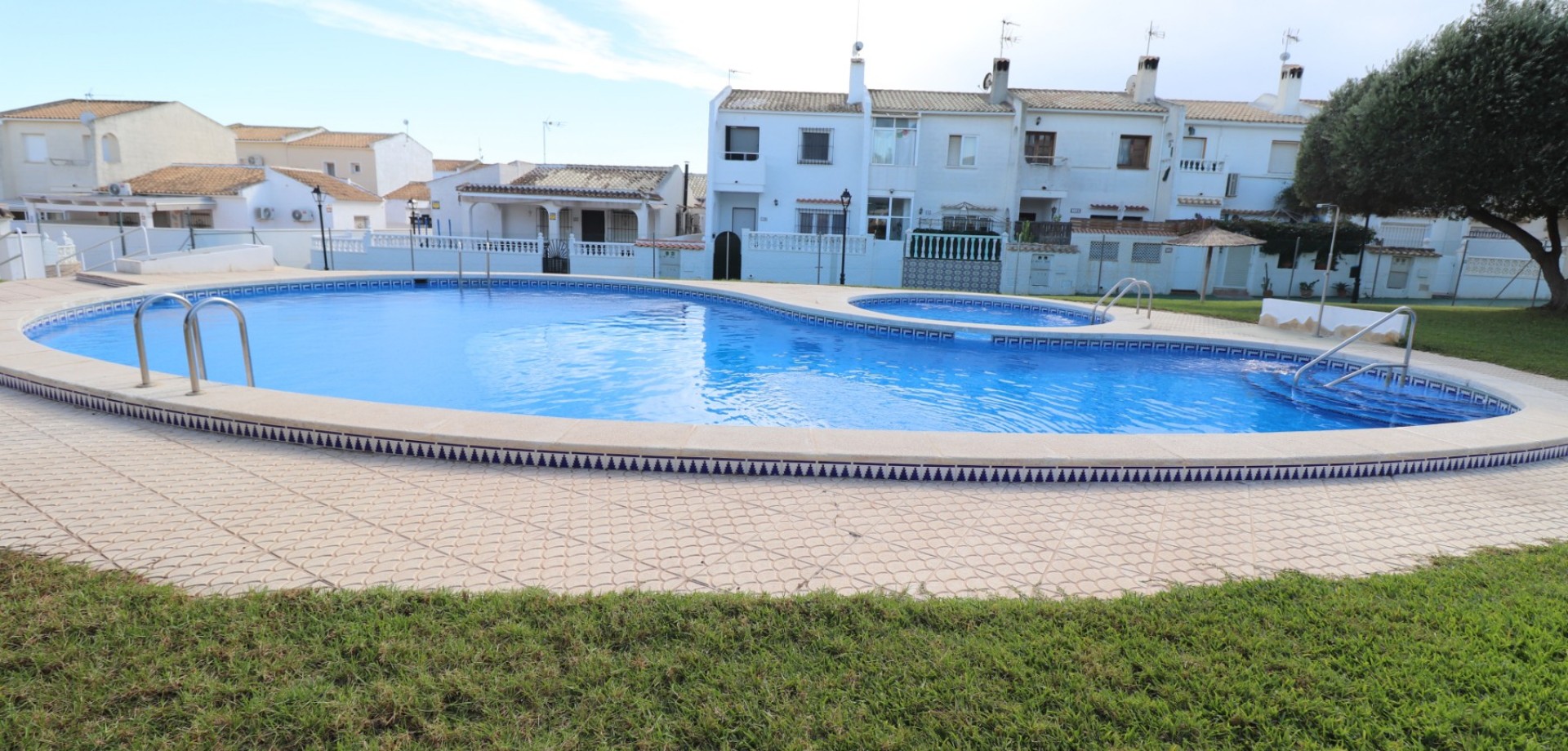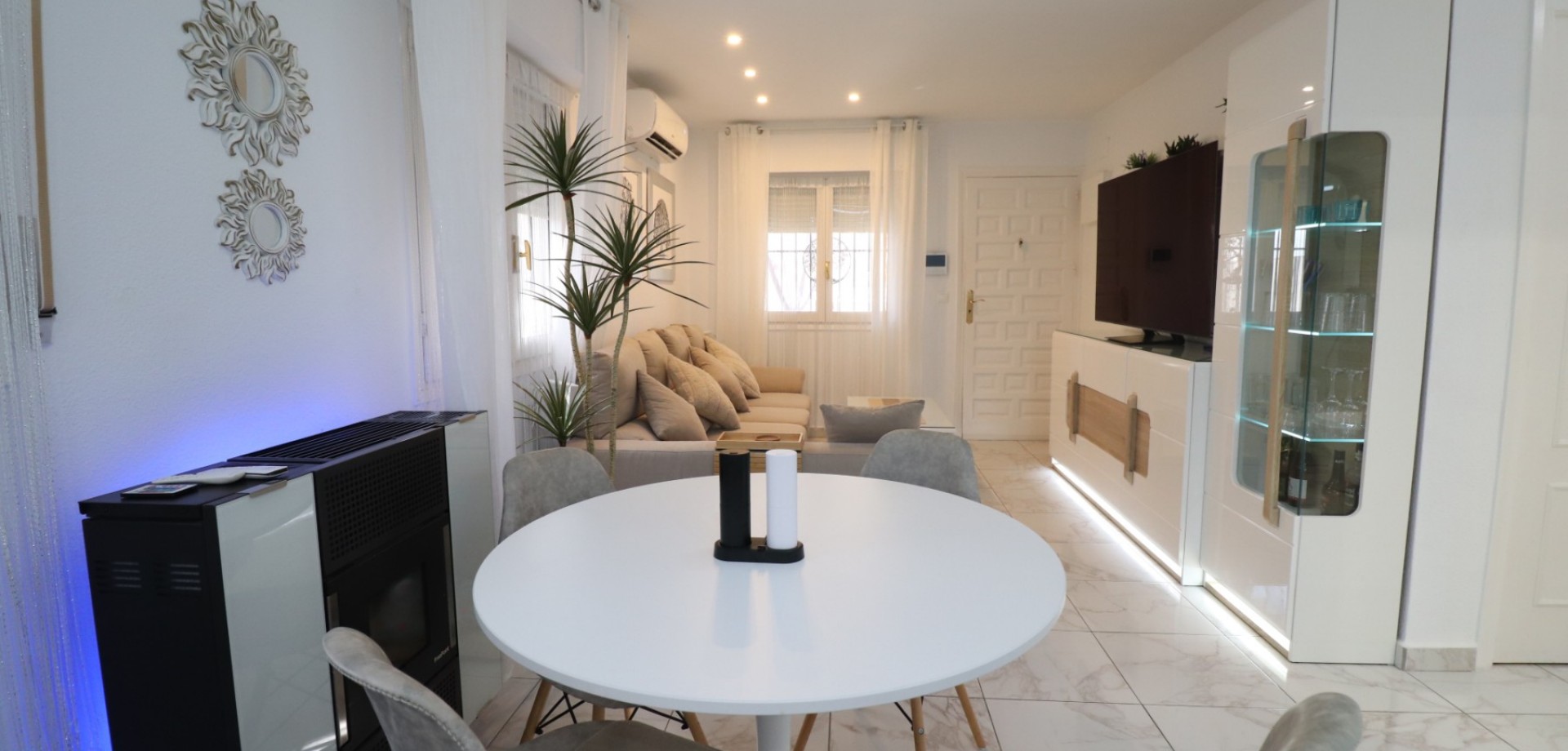 This South West Facing, Three Bedroom, Detached Villa in La Florida is located within a popular residential area, just a 2 minute walk to the nearby commercial centre with a variety of amenities. The well-known Emerald Isle entertainment venue—with bowls club, restaurant, and pool—is just a couple of minutes away, while La Zenia Boulevard, stunning beaches, and several golf courses can be reached within a 10 minute drive. Beautifully presented throughout, this single-level villa offers a 90m² build on a 210m² low-maintenance tiled plot. A covered entrance terrace leads into a bright lounge/dining room featuring a cosy pellet burner, and an open-plan fitted kitchen with breakfast bar and adjoining utility room with direct outside access. There are three double bedrooms, the master with fitted wardrobes, and two sleek modern shower rooms, one of which is en suite. The exterior space includes a private splash pool, perfect for cooling off, while residents also have access to two well-maintained communal pools. Additional features include air conditioning, making this a comfortable home year-round. An ideal full-time residence, holiday home, or rental investment opportunity on the sought-after Costa Blanca South.
