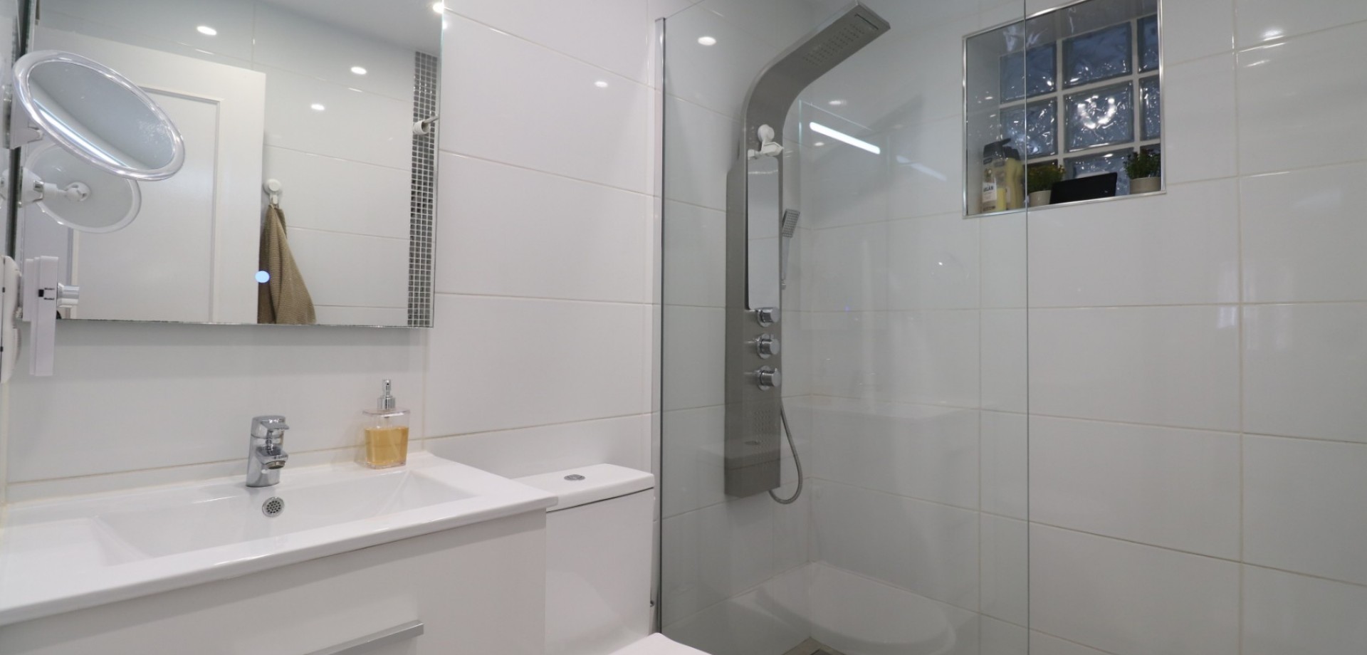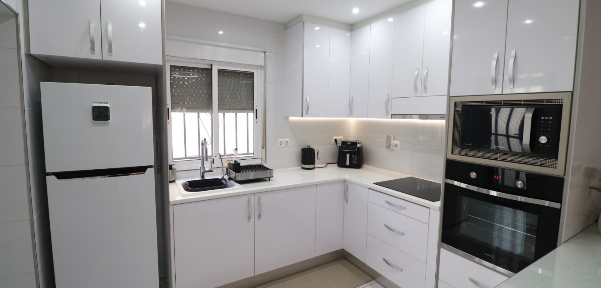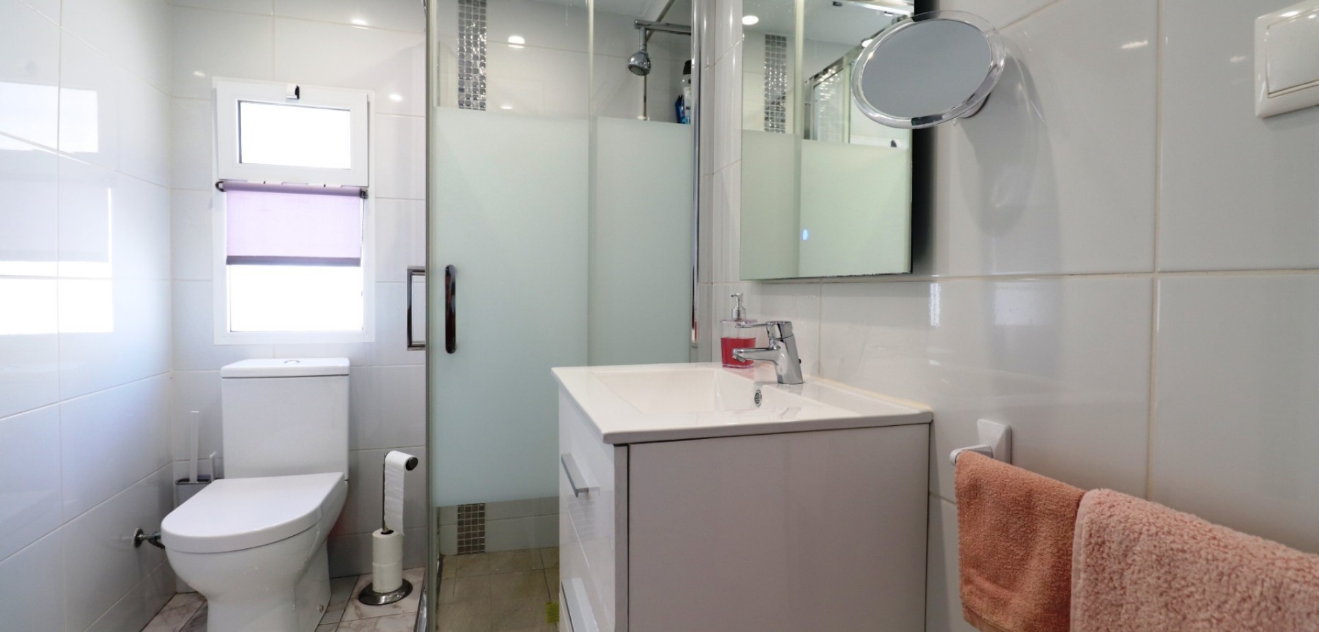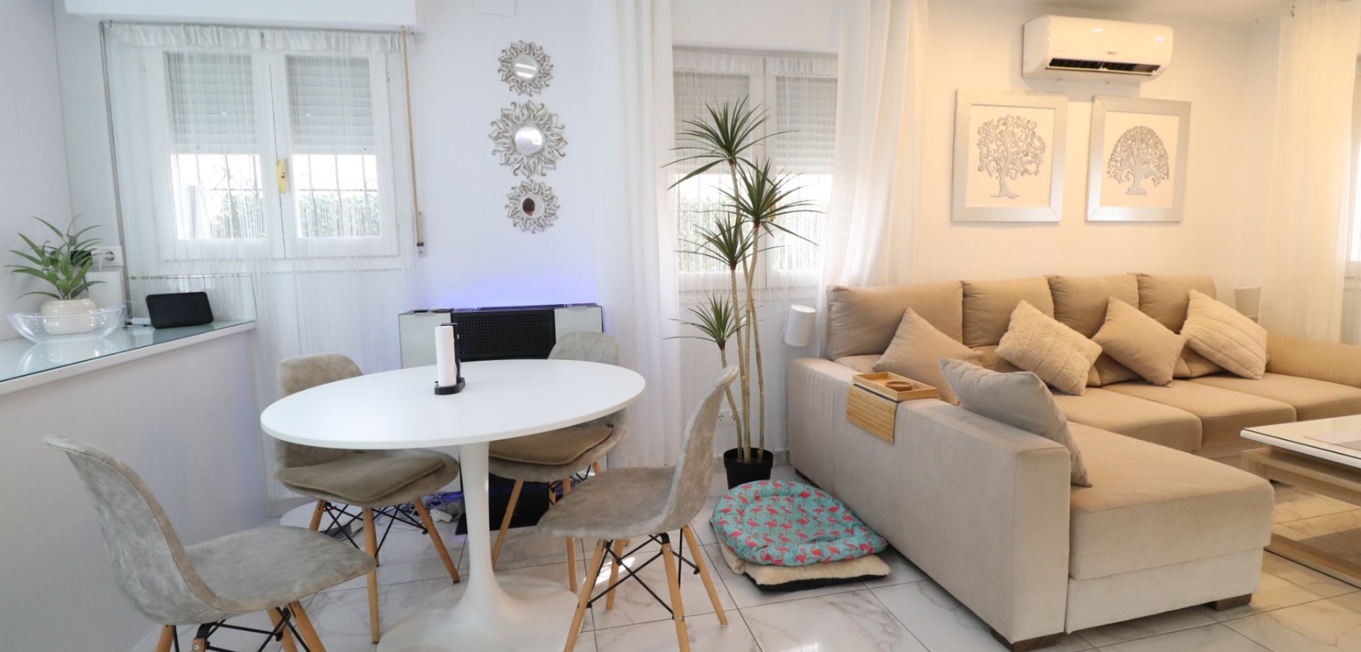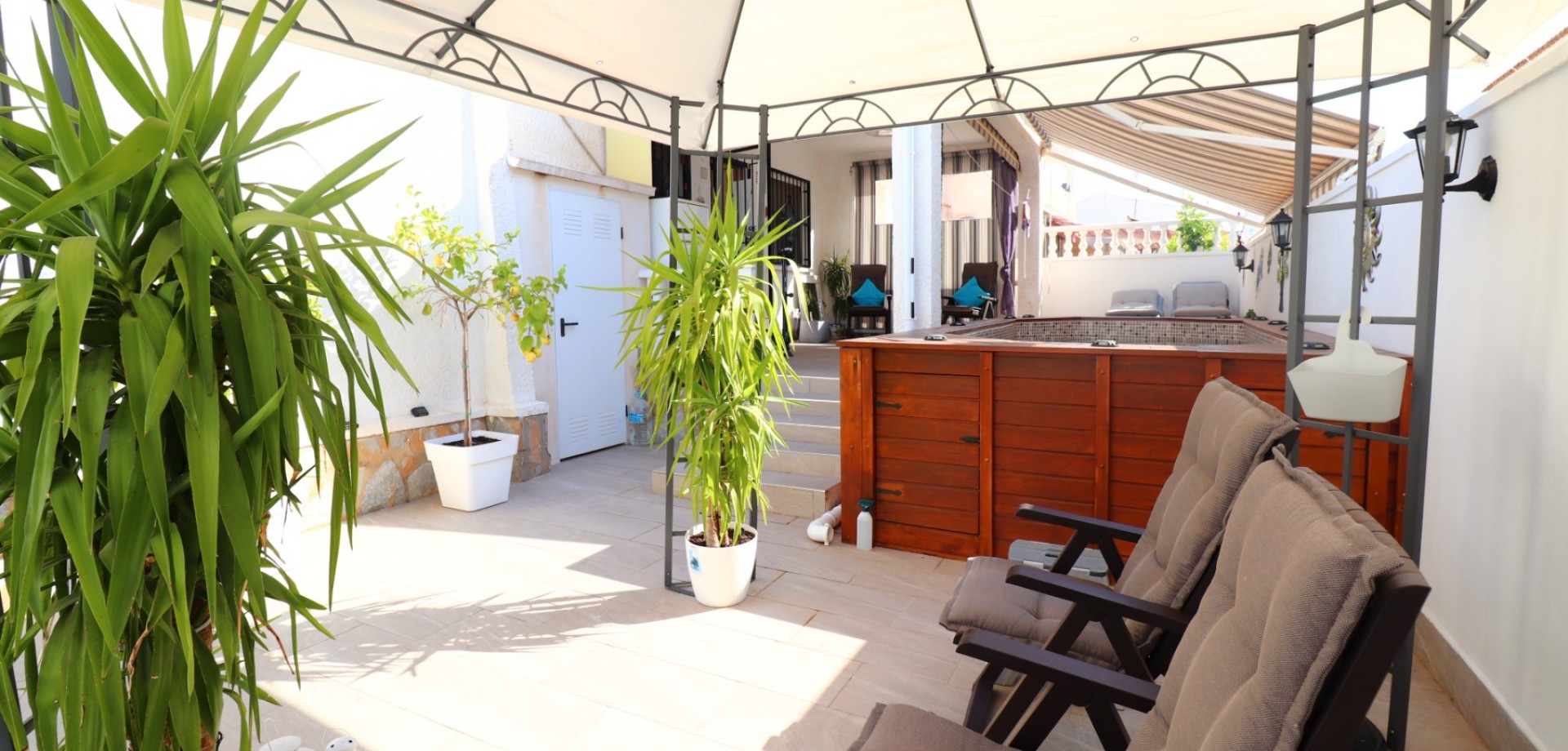 This South West Facing, Three Bedroom, Detached Villa in La Florida is located within a popular residential area, just a 2 minute walk to the nearby commercial centre with a variety of amenities. The well-known Emerald Isle entertainment venue—with bowls club, restaurant, and pool—is just a couple of minutes away, while La Zenia Boulevard, stunning beaches, and several golf courses can be reached within a 10 minute drive. Beautifully presented throughout, this single-level villa offers a 90m² build on a 210m² low-maintenance tiled plot. A covered entrance terrace leads into a bright lounge/dining room featuring a cosy pellet burner, and an open-plan fitted kitchen with breakfast bar and adjoining utility room with direct outside access. There are three double bedrooms, the master with fitted wardrobes, and two sleek modern shower rooms, one of which is en suite. The exterior space includes a private splash pool, perfect for cooling off, while residents also have access to two well-maintained communal pools. Additional features include air conditioning, making this a comfortable home year-round. An ideal full-time residence, holiday home, or rental investment opportunity on the sought-after Costa Blanca South.
