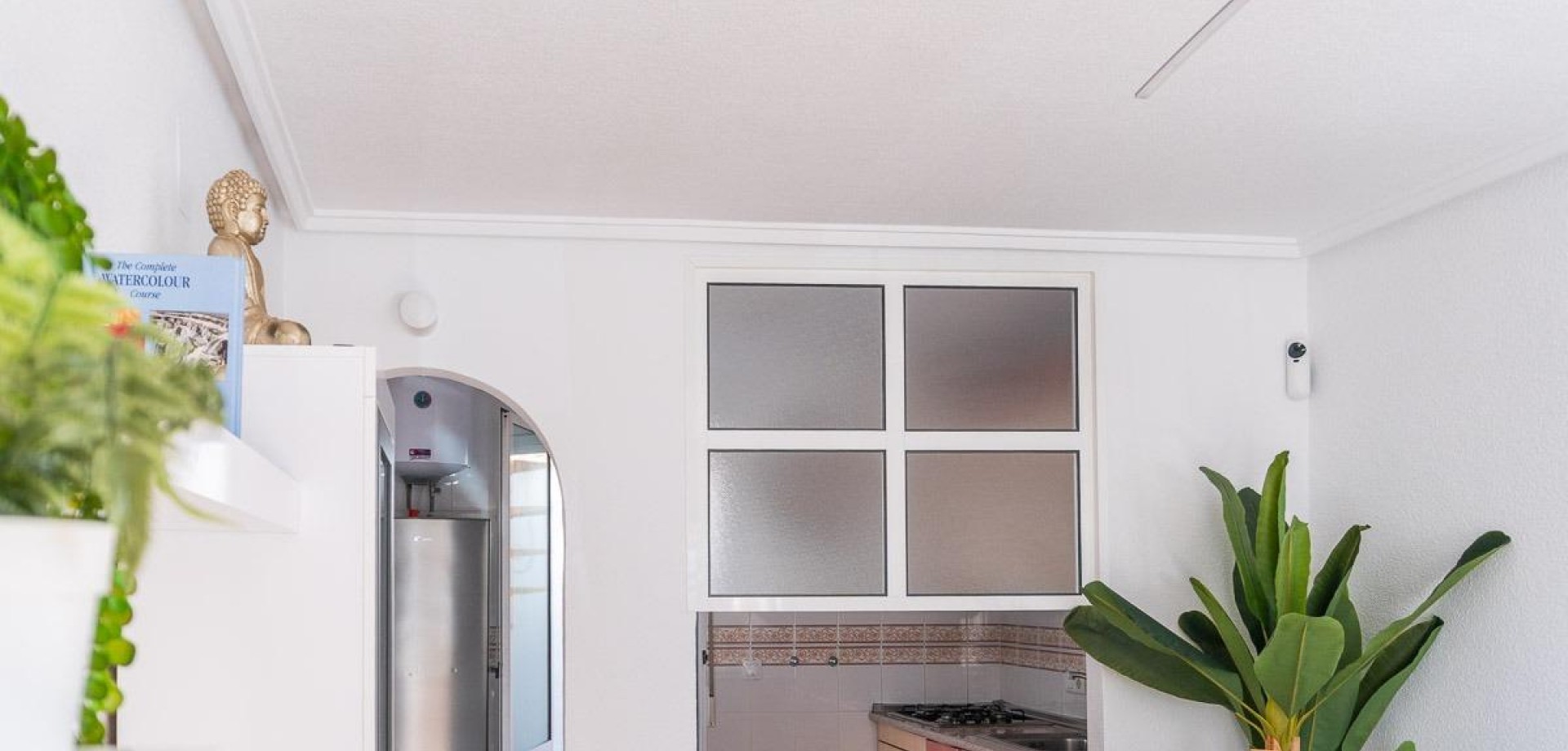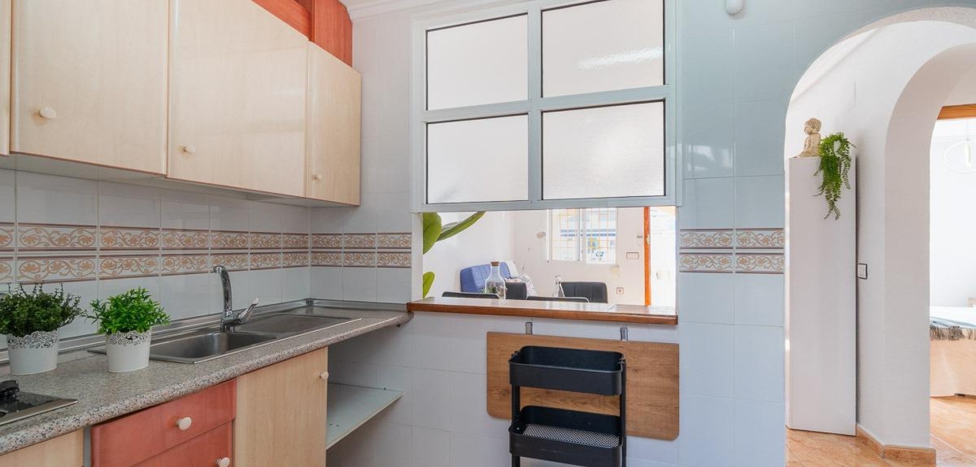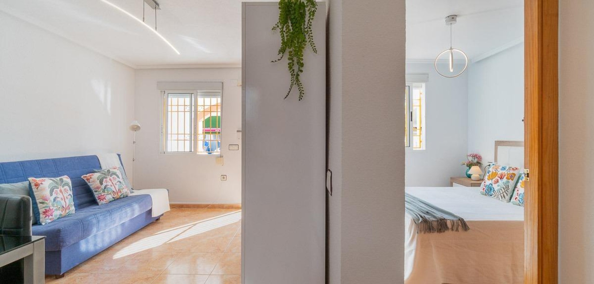 Discover this charming townhouse in Altos del Limonar, one of the most sought-after areas of Torrevieja to live all year round thanks to its peaceful atmosphere, excellent location, and wide range of nearby services. The property is located in a private residential complex with a communal pool and green areas, perfect for enjoying the Mediterranean climate in a safe and well-kept environment.. . The house features private parking within the plot, a cozy front porch, and upon entering, a spacious living-dining room connected to an independent kitchen. At the back, there is a private patio with a spiral staircase leading to a private solarium, ideal for relaxing or as extra outdoor space. It also offers two bedrooms, a bathroom, and east-west orientation, ensuring natural light throughout the day.. . The location is excellent: next to schools and institutes, very close to the Natural Park of the Salt Lakes of Torrevieja, surrounded by shopping centers, and with easy access to the extension of the new areas of Torrevieja.. . Thanks to all these features, this property is ideal both as a permanent residence and as a holiday or seasonal rental, especially attractive for teachers and professionals working in the nearby educational centers.