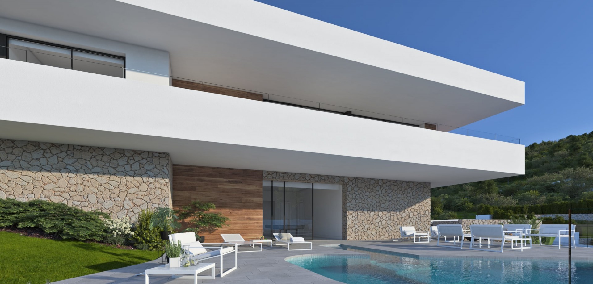 Villa Brisa del Mar, situated on a prime plot within the exclusive Residencial Jazmines, just a short drive from Moraira. This stunning propertyis distinguished by its modern architecture characterised by clean lines that blend seamlessly into the natural Mediterranean environment. The façade incorporates noble materials such as stone and wood, adding warmth and character that contrasts beautifully with the pristine white of its sleek volumes. The interior has been thoughtfully designed to maximise connection with the landscape and sea. The spacious open-plan living area—which includes the living room, dining space, and kitchen— provides access to a main terrace that spans the entire façade. Large sliding picture windows blur the boundary between indoors and outdoors, offering uninterrupted views of the sea and Peñón de Ifach from every part of the room. Interior finishes, with wooden floors, bespoke carpentry, and carefully selected furniture in neutral tones, evoke serenity, comfort, and sophistication. On the main floor, there are three double bedrooms, all with direct access to the terrace and built-in wardrobes, along with a master suite that boasts a generous dressing room and en-suite bathroom. Every element is crafted to create a spacious, functional, relaxed, and elegant environment. The outdoor area serves as a private sanctuary, featuring a Mediterranean garden, relaxation zones, and a stunning infinity pool with a curved design, which adds a sculptural element to the landscape and serves as the focal point for outdoor living. When illuminated at night, warm lighting accentuates the architecture and greenery, fostering a cosy and inviting atmosphere. Access from the street to Villa Brisa del Mar is straightforward via a smooth paved ramp leading directly to a covered porch that can accommodate two vehicles. This space is integrated into the side façade, blending seamlessly thanks to its stone cladding and cohesive architectural style. From the covered garage, you can enter the basement directly, connected internally to the house via a staircase, offering privacy, practicality, and protection from the weather.