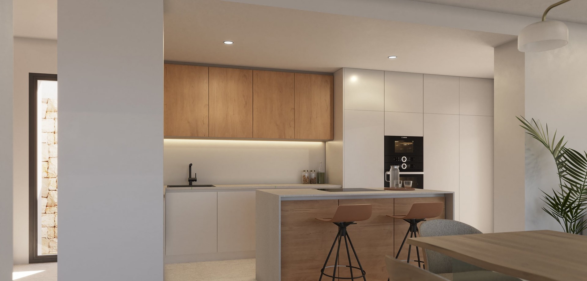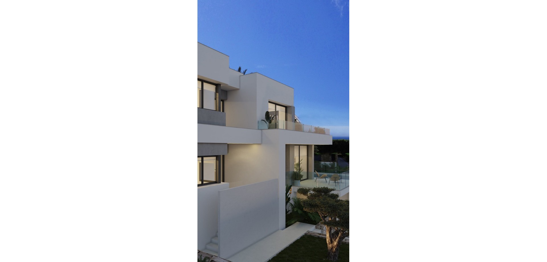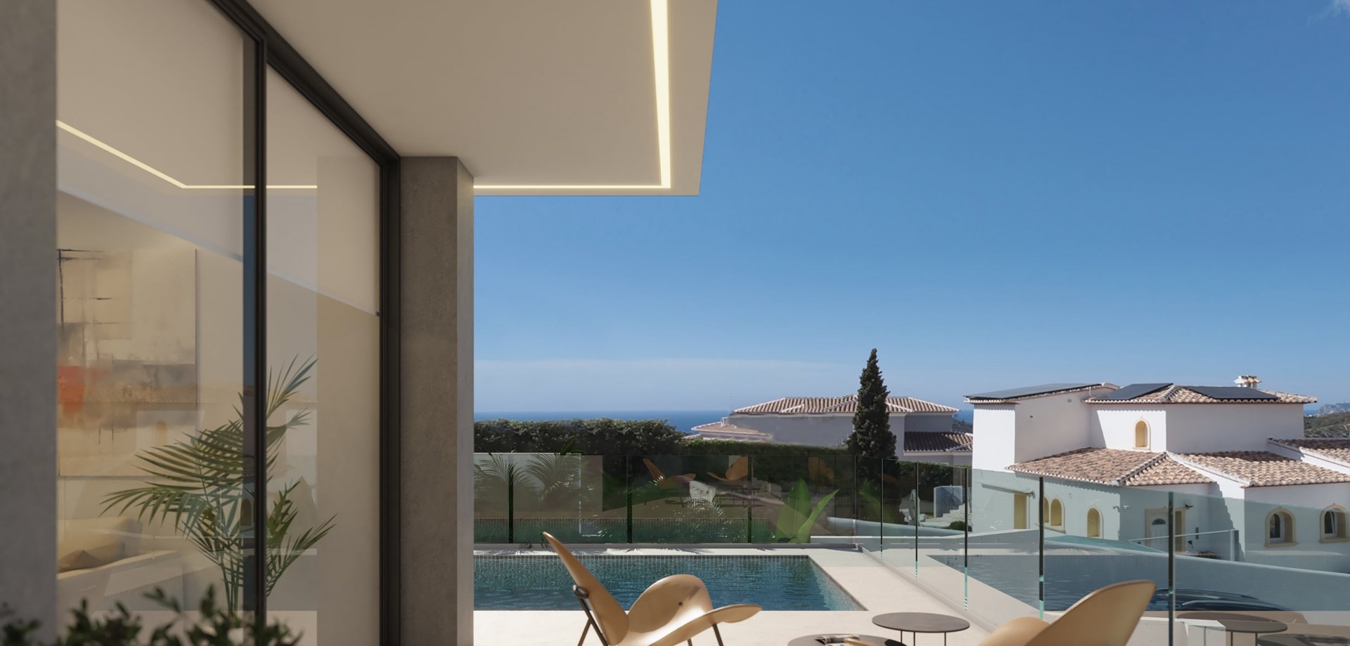 Villa Bianca, situated on plot 74 of Residencial Magnolias in Cumbre del Sol, stands out for its contemporary architecture, spacious interiors, and orientation towards the Mediterranean Sea. This exclusive development combines modern design, practicality, and sweeping horizon views, providing a lifestyle full of comfort and elegance. Villa Bianca is built on two floors and a basement. The main floor is the heart of the house: an open space where the kitchen, dining area, and living room merge, all with direct access to the terrace and infinity pool. This level also includes an en-suite bedroom and a guest WC. Upstairs are two generous bedrooms with en-suite bathrooms and access to a large private terrace, perfect for enjoying the weather and the views. The basement offers over 80 m² of open space, complete with a private terrace, and can be configured as a guest bedroom, gym, office, or any other space the future owner may require. The interior design has been carefully planned, using a palette of natural materials like wood, stone, and neutral colours that add warmth to the spaces. The kitchen stands out for its practicality and modern look, featuring top-brand appliances and a central island with a breakfast bar. The dining and living areas, filled with natural light thanks to large windows, are connected to the outside through decor that prioritises comfort without sacrificing elegance. Outside, the infinity pool becomes the focal point of outdoor life, with lounging areas, outdoor dining, and a garden terrace overlooking the sea. The entire project has been designed to be functional, efficient, and aesthetically pleasing, with particular attention to detail and finishes.