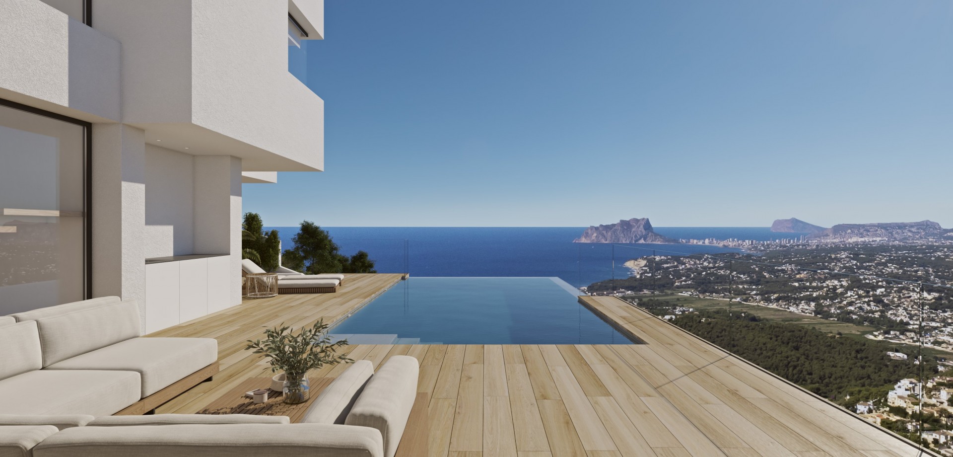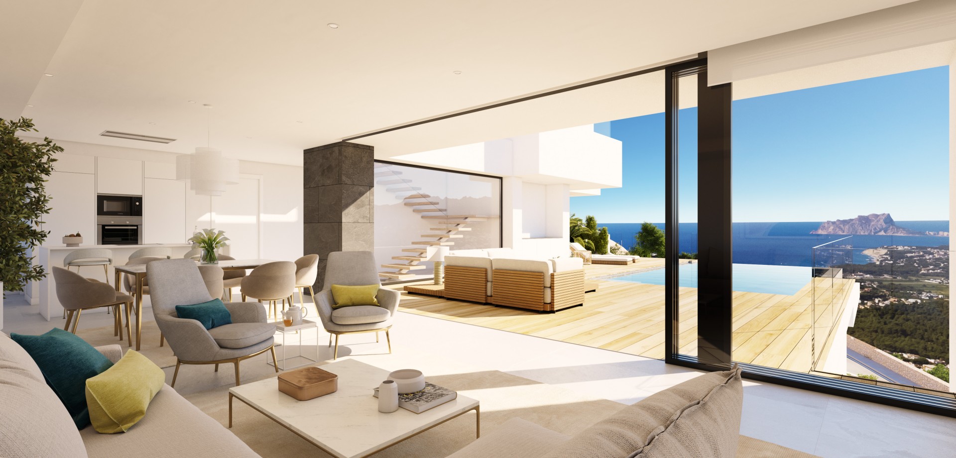 Villa Karma is situated in an exclusive enclave of Cumbre del Sol, on plot 222 Jazmines, Here, the lights of Calpe and Moraira illuminate the nights and Montgó is visible on the horizon. Every architectural detail of this residence has been carefully crafted to inspire, and each room radiates calm and harmony. Its understated, contemporary design, seamlessly integrated with the landscape, enhances the endless views that accompany everyday life. Built on three floors, the house is designed to follow the natural contours of the plot, creating unique spaces on each floor. The main floor features the daytime area, where the living room, dining room, and kitchen are integrated into an open-plan space that connects to the terrace through sliding picture windows. This level also includes a master bedroom, designed as a private suite with an en-suite bathroom and dressing room, as well as a guest toilet. Upstairs, three additional bedrooms with access to private terraces and two full bathrooms provide privacy and functionality. The lower level offers a large multifunctional area that can serve as a gym, cinema, office, or storage, along with an outdoor porch and chill-out zone. The house is accessed from the top of the plot, featuring a direct entrance into an elegant lobby that connects to the upper floor. The enclosed garage, located on the same level, has space for two vehicles, discreetly integrated into the architectural structure and providing convenient access from the street. Villa Karma features advanced construction solutions and a high level of comfort. It includes an aerothermal air conditioning system with underfloor heating, double-flow ventilation with heat recovery, aluminium exterior carpentry with thermal bridge break, and solar-insulated glazing. Recessed LED lighting and home automation for managing blinds, lighting, and air conditioning offer added comfort and efficiency. A panoramic view stretching from the Peñón de Ifach to the lights of the coast can be enjoyed from the infinity pool and terraces. The southwest orientation of the house ensures stunning sunsets and warm light that fills the home throughout the day. More than just a dwelling, Villa Karma offers an elevated wellness experience on the Mediterranean.