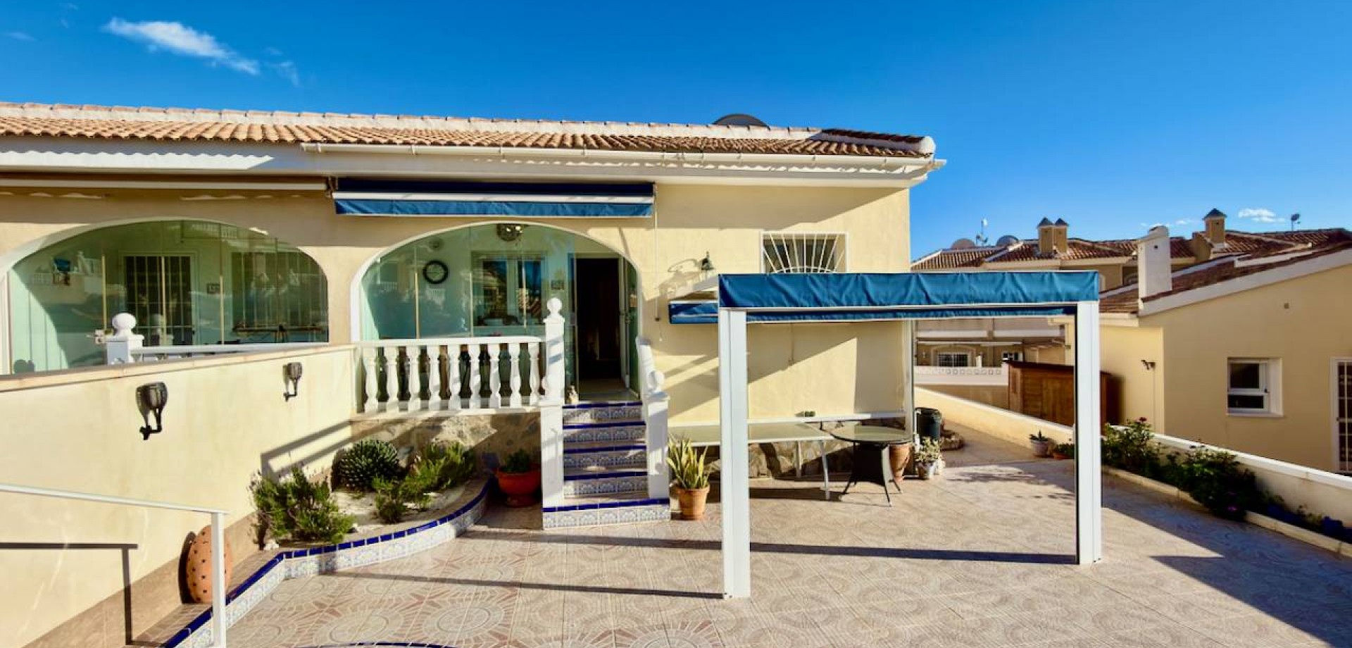 The property offers 90 m² of built living space on a generous 300 m² plot, providing an excellent balance of indoor and outdoor living. Inside, the villa comprises three spacious bedrooms with fitted wardrobes and two bathrooms, including a master bedroom with an en-suite.