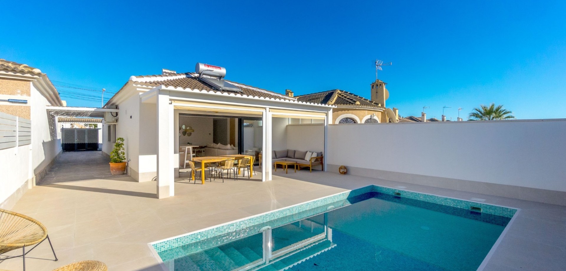 This newly renovated detached villa for sale in El Chaparral, Torrevieja, offers an exceptional combination of modern elegance, comfort, and energy efficiency, all set within a quiet and family-friendly residential area surrounded by nature.