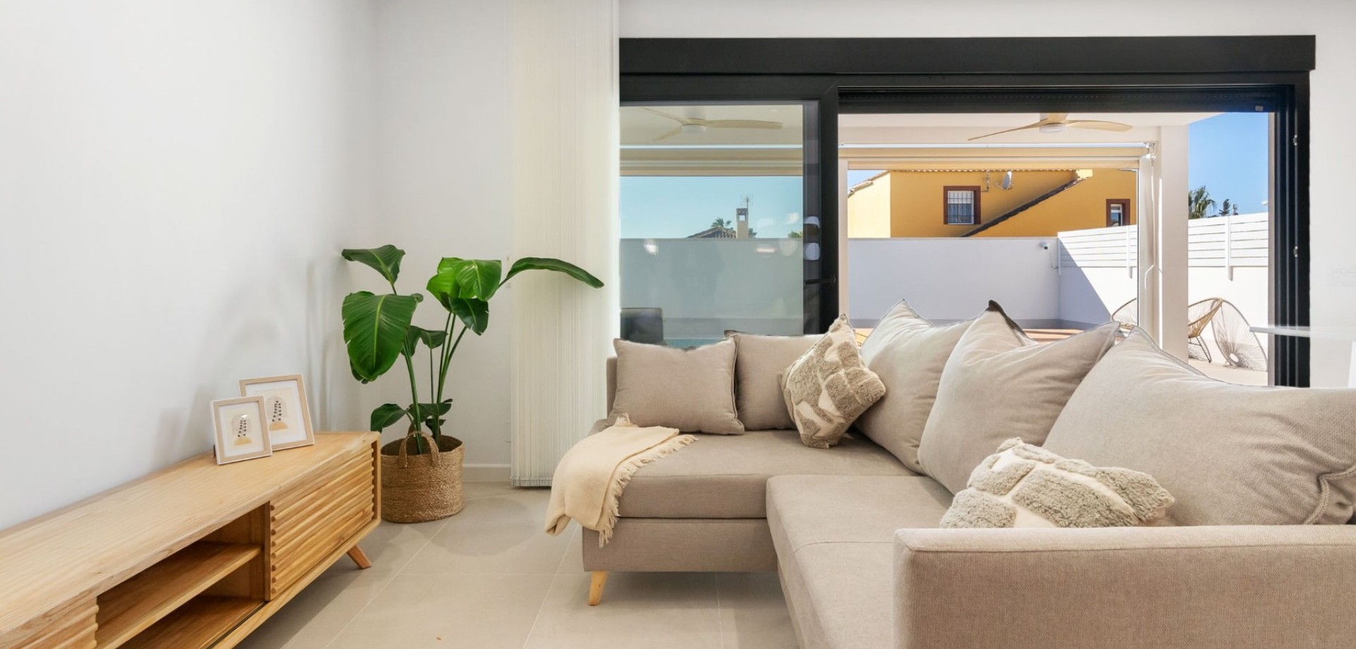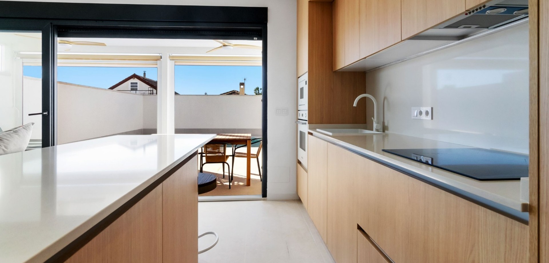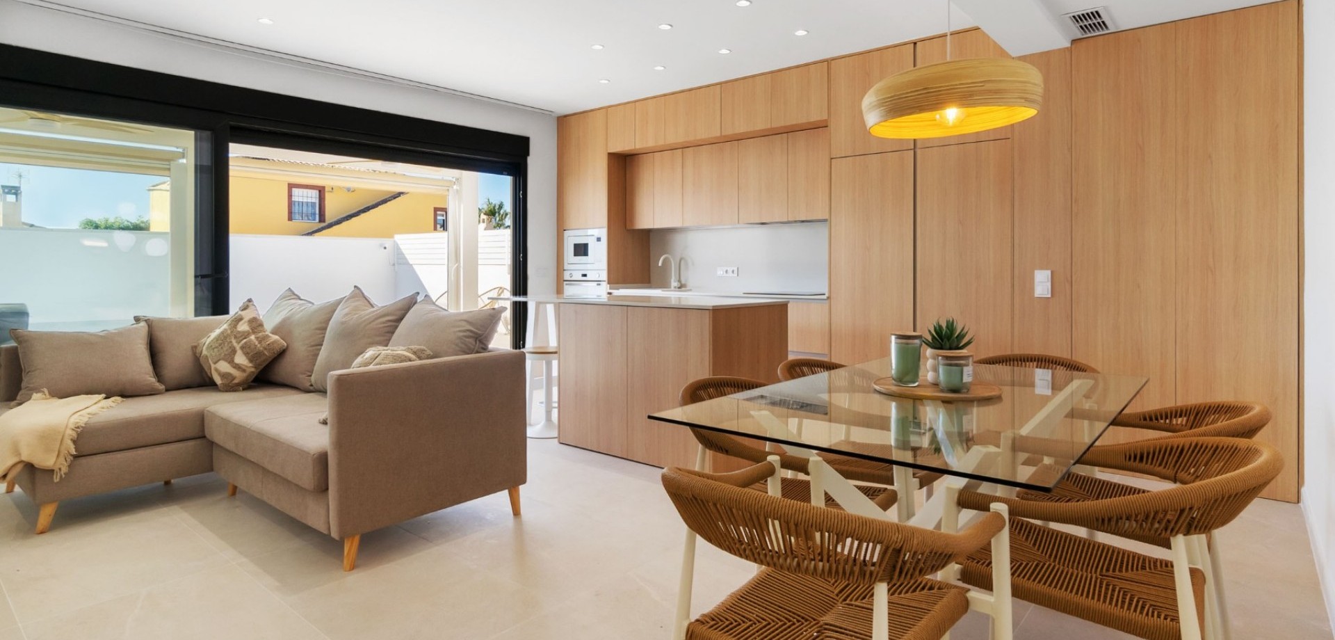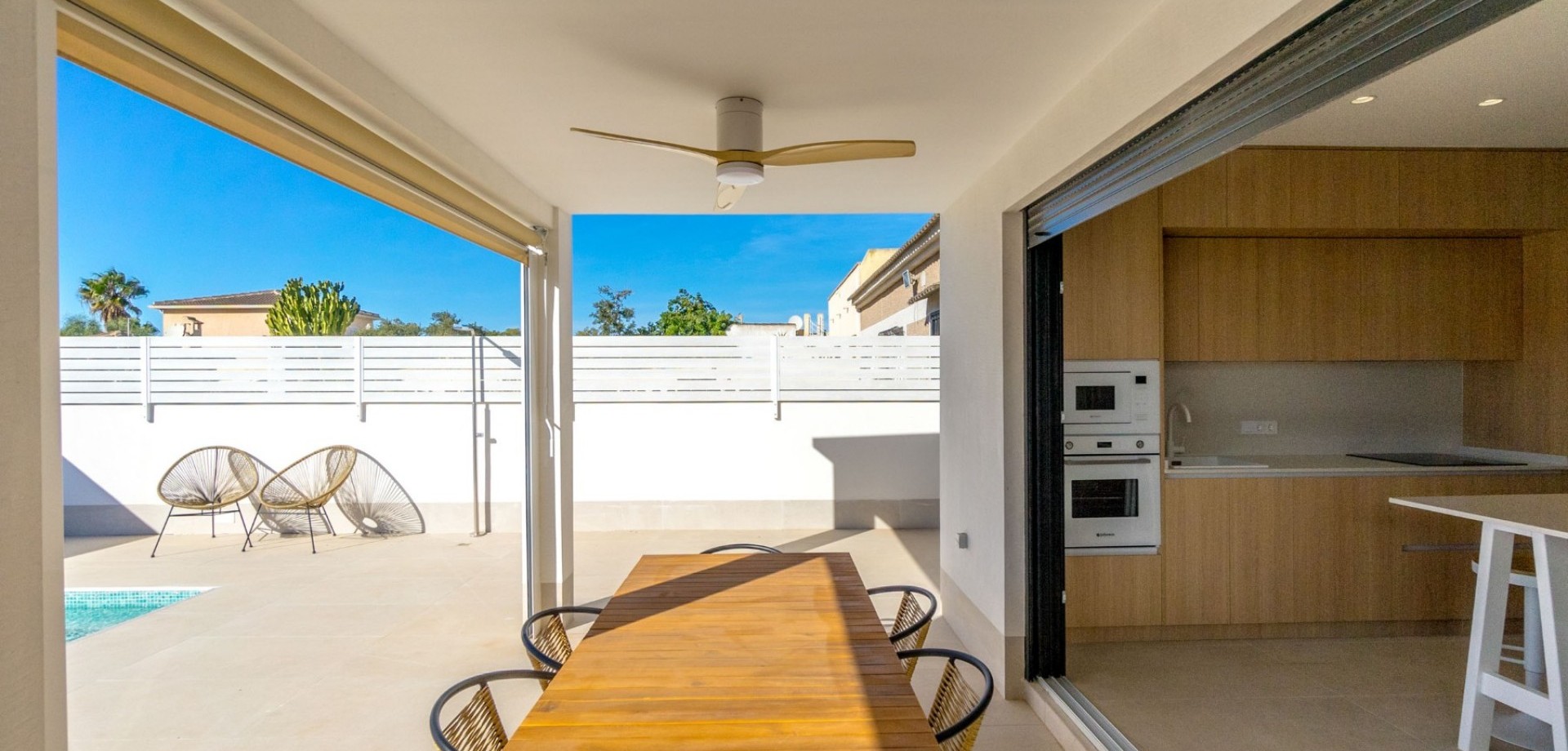 The bright open-plan living and dining area flows seamlessly into a fully equipped contemporary kitchen, creating an inviting and functional living space. Large sliding doors open onto a covered terrace overlooking the private swimming pool with outdoor shower, ideal for enjoying the villa’s south-west orientation and year-round sunshine.