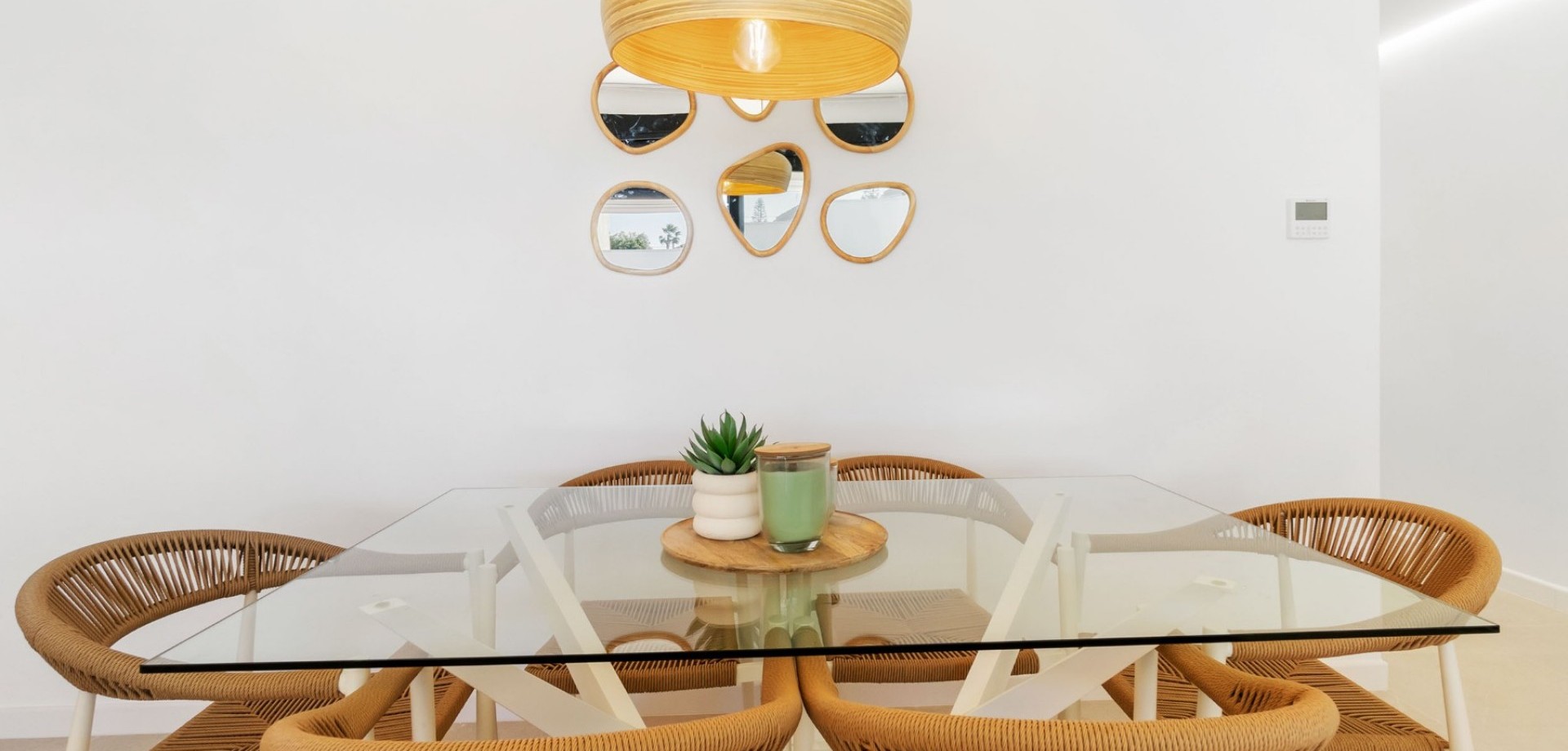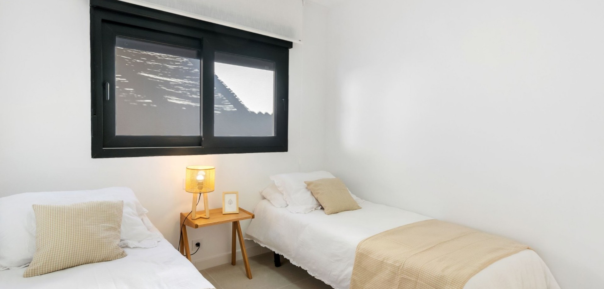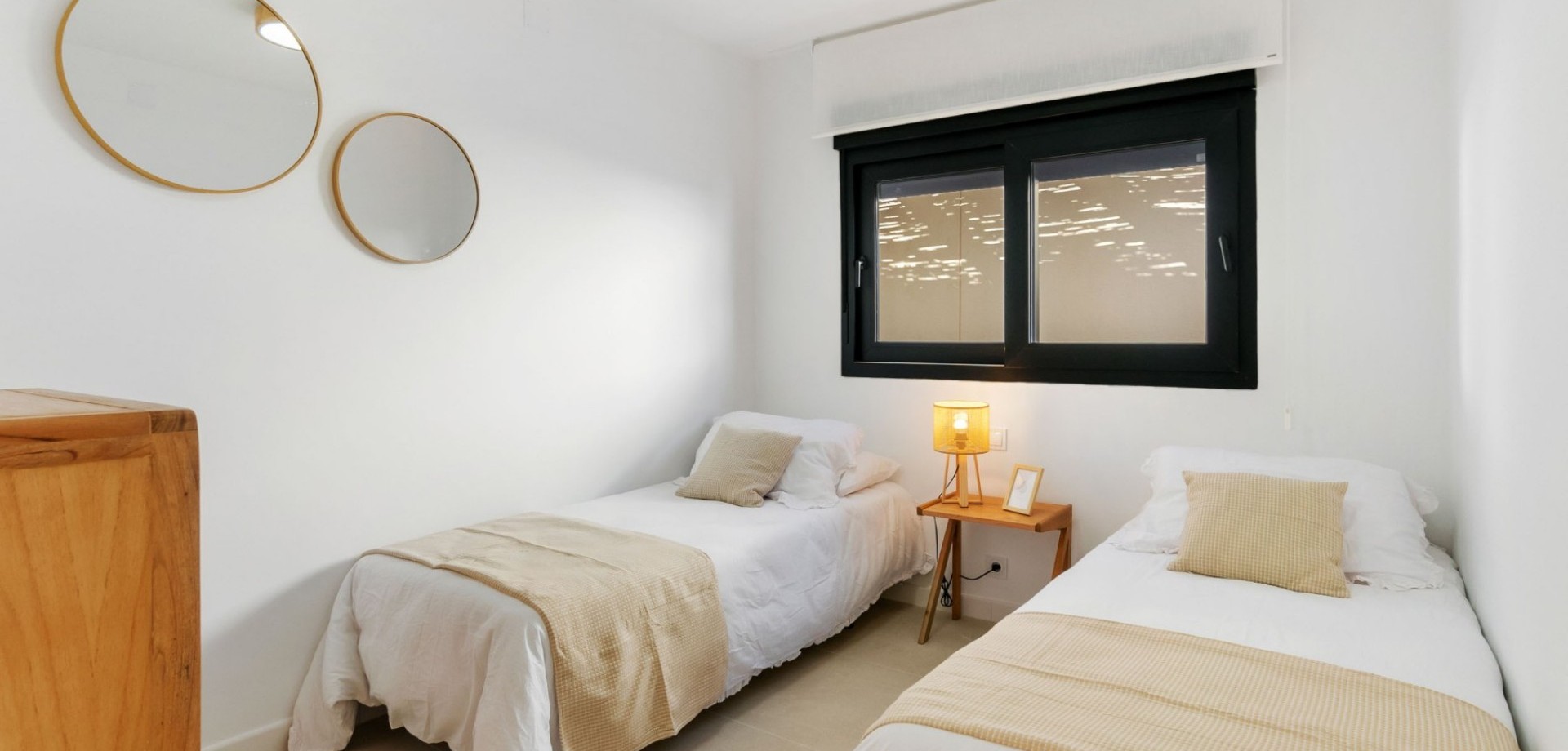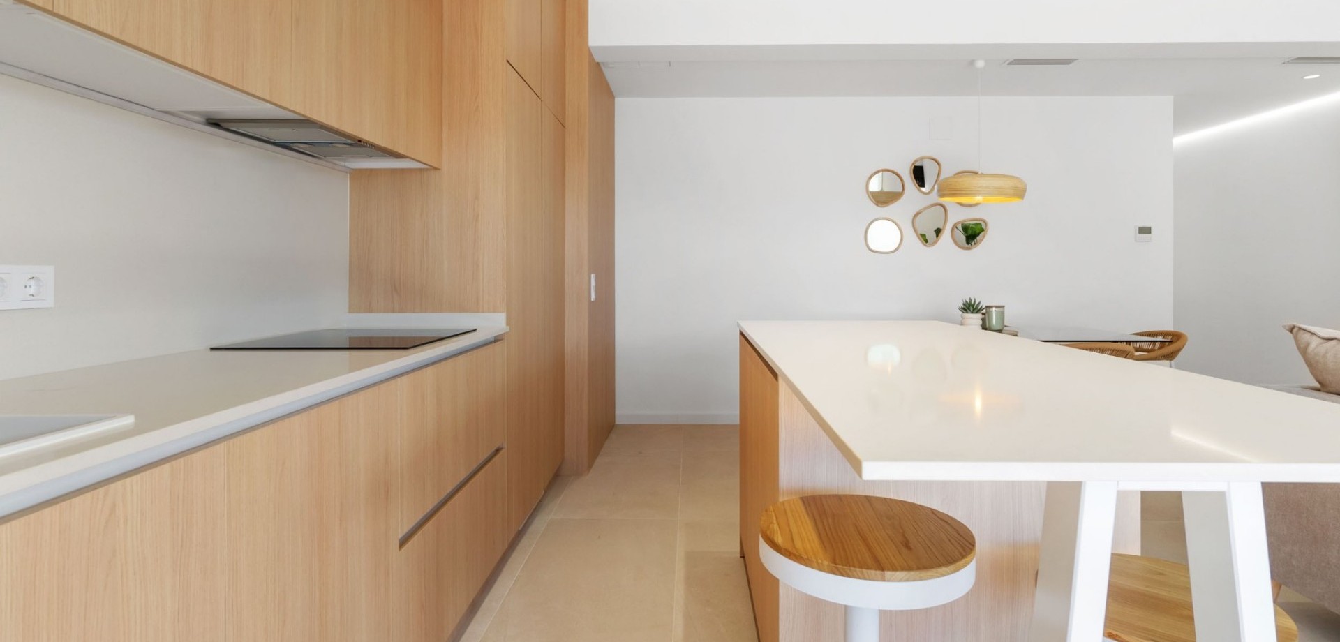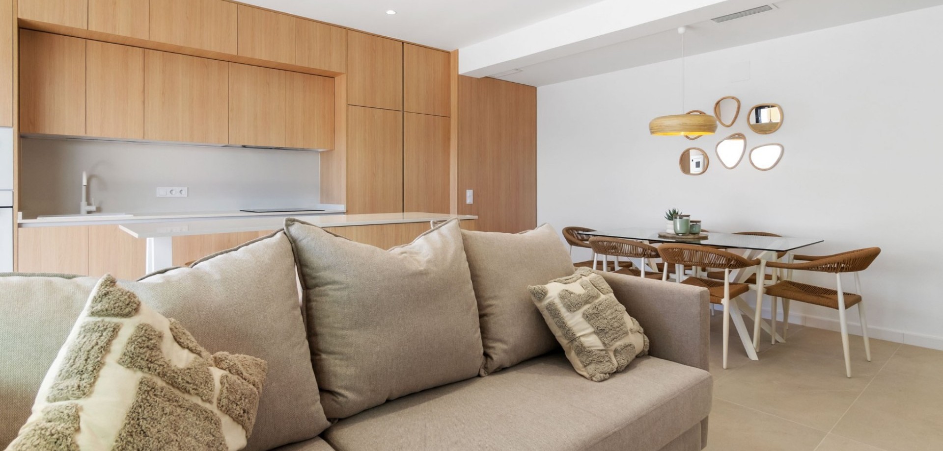 The bright open-plan living and dining area flows seamlessly into a fully equipped contemporary kitchen, creating an inviting and functional living space. Large sliding doors open onto a covered terrace overlooking the private swimming pool with outdoor shower, ideal for enjoying the villa’s south-west orientation and year-round sunshine.