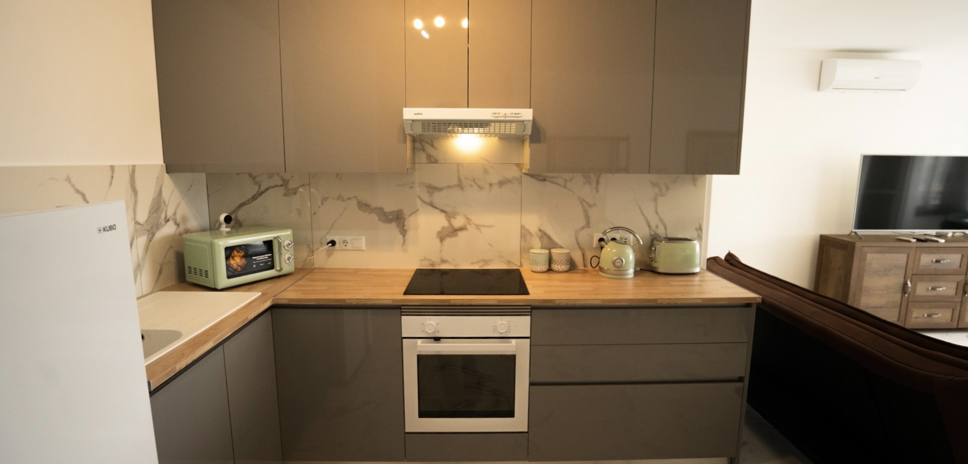 The apartment features a bright and generous living space, a modern fitted kitchen, a large double bedroom, and a stylish refurbished bathroom, creating a comfortable and contemporary home ideal for holiday living, permanent residence, or rental investment.