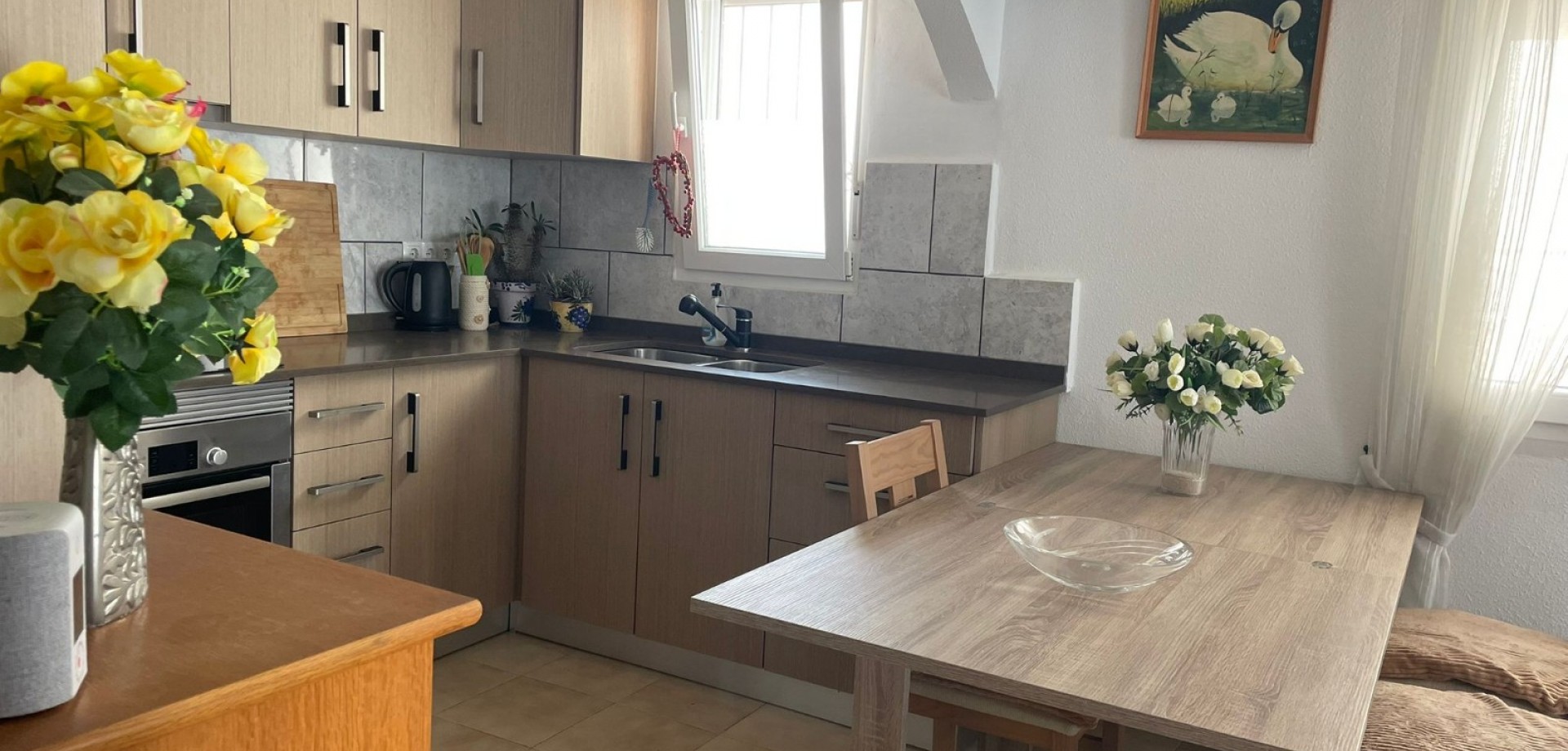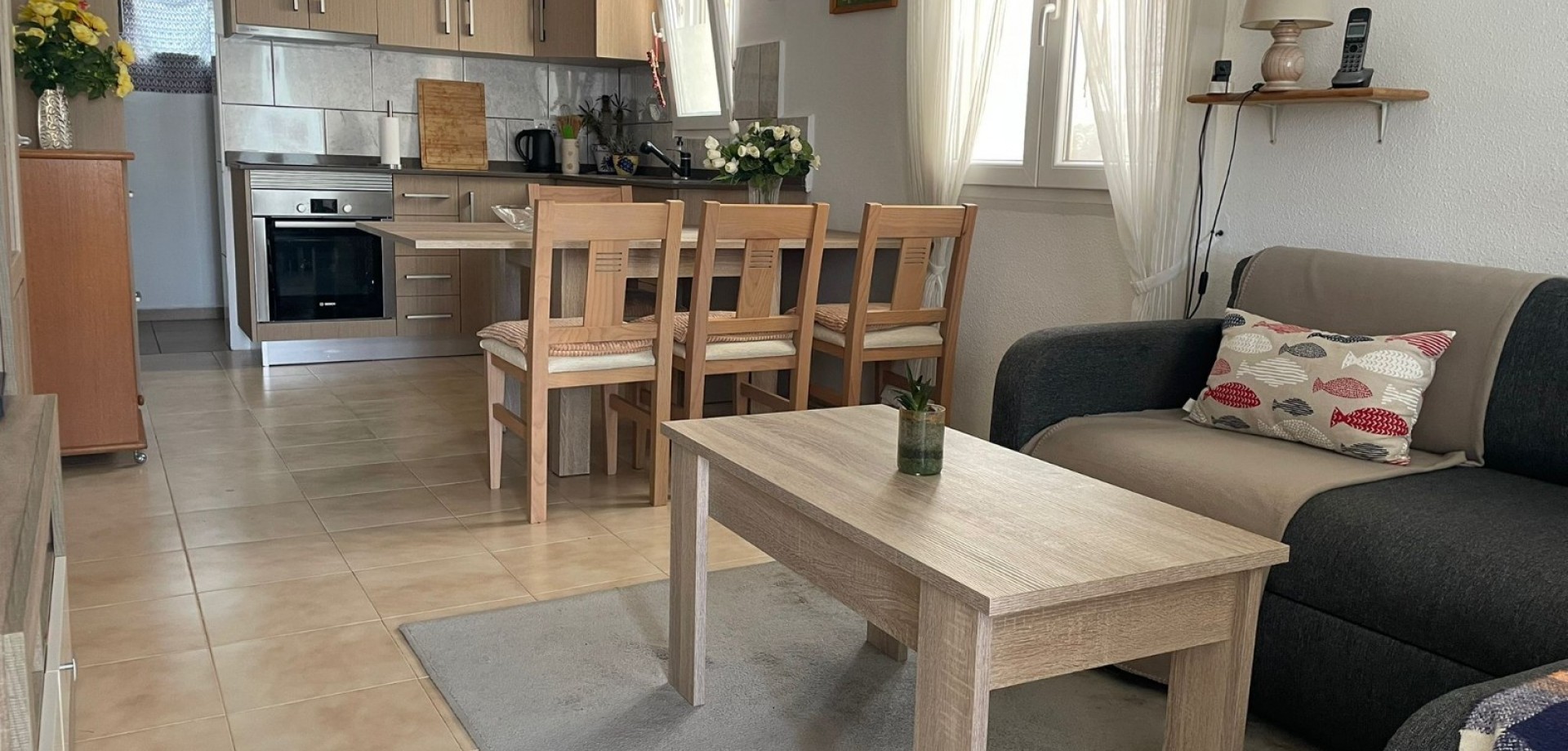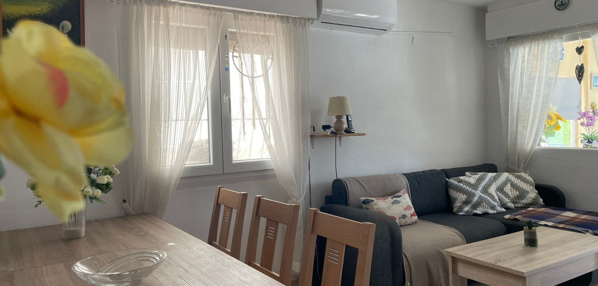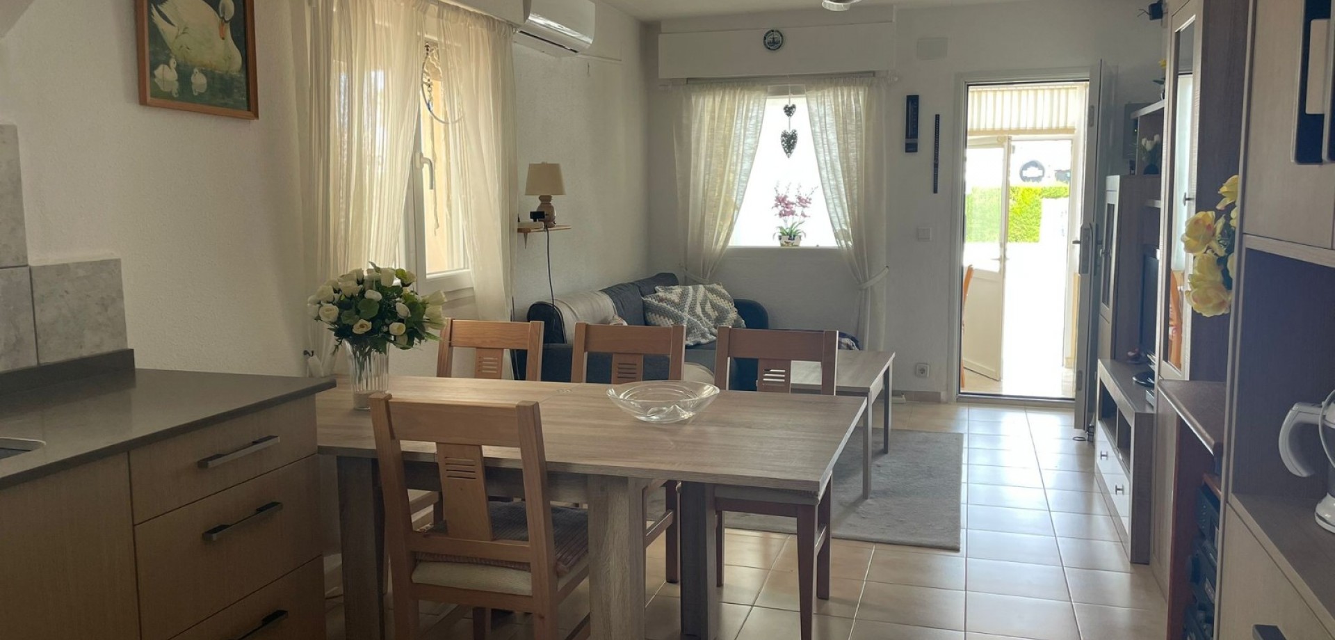 The home offers 2 spacious bedrooms and 1 bathroom, along with a modern open-plan kitchen, renovated just two years ago and fully equipped. The property is sold fully furnished, making it ideal as a permanent residence, holiday home, or rental investment on the Costa Blanca.