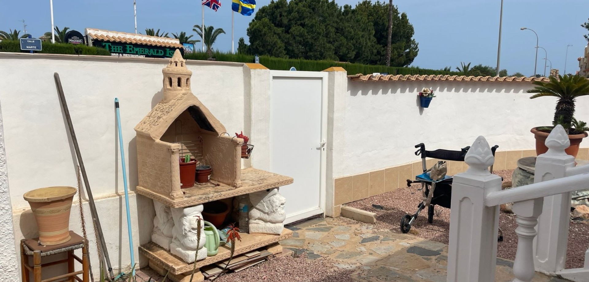 Outside, you’ll find a fully enclosed private garden, perfect for relaxing or entertaining, as well as a large, sunny solarium where you can enjoy the Mediterranean climate year-round. The property also includes a garage and additional parking, a valuable feature in this popular area.