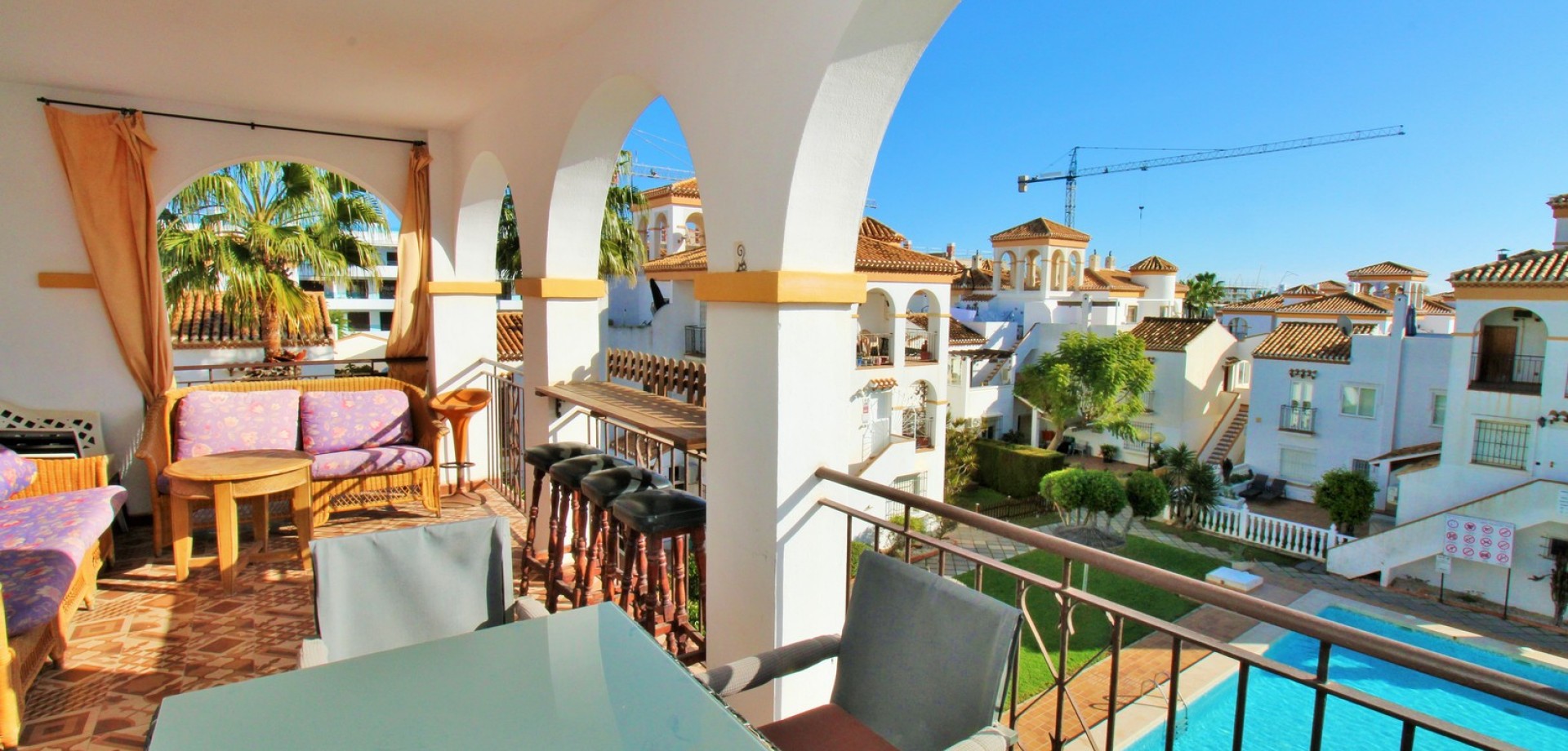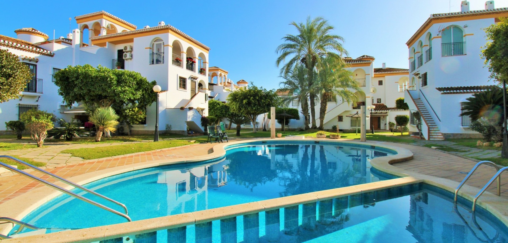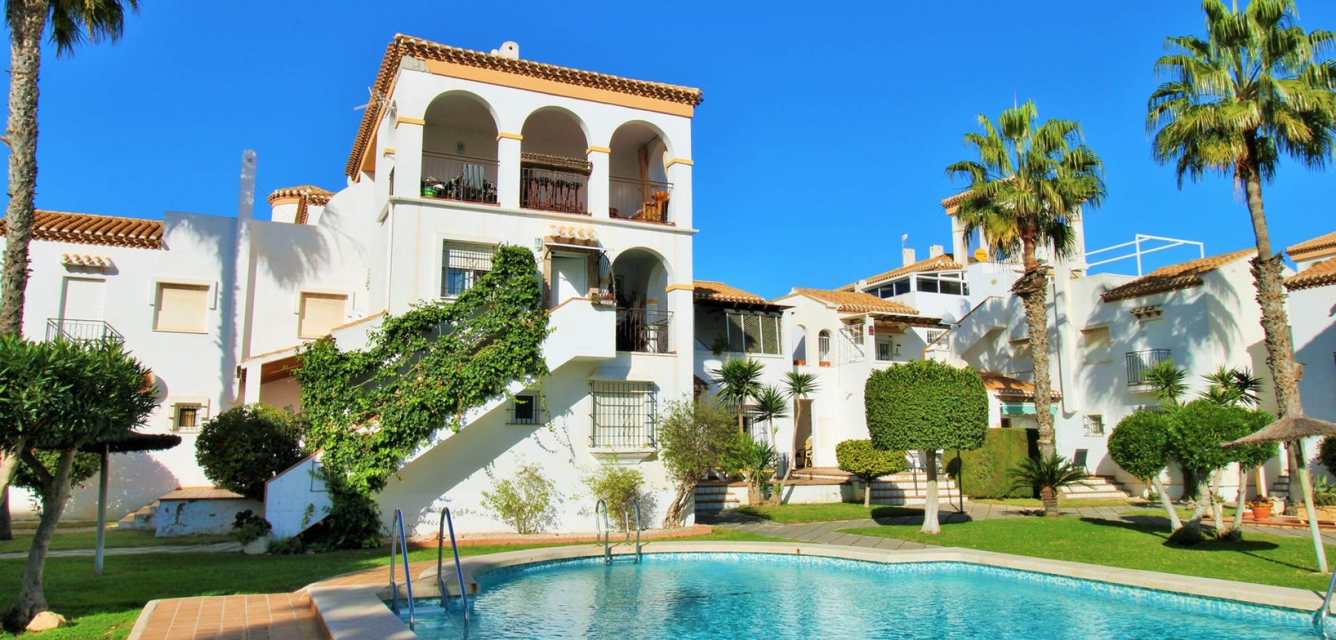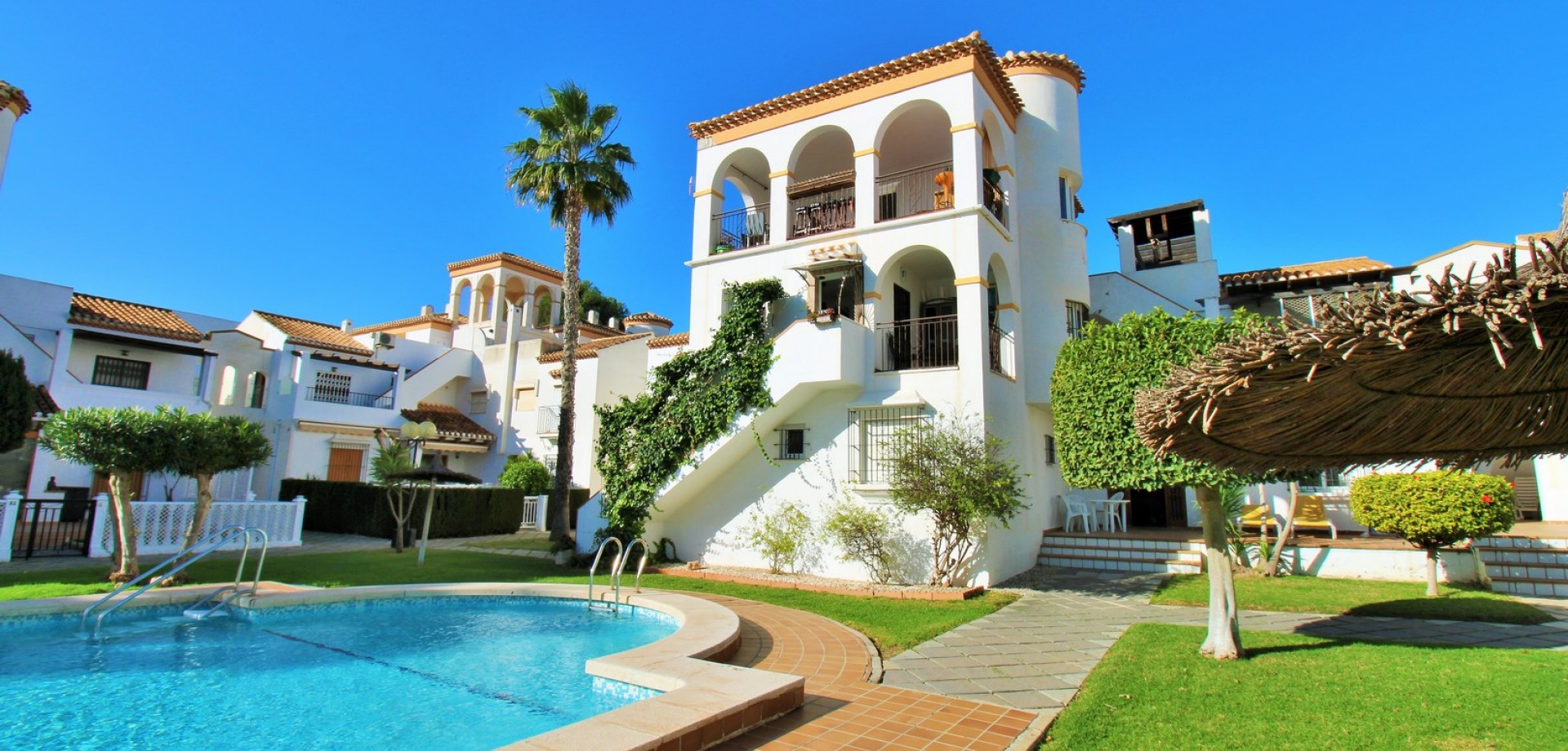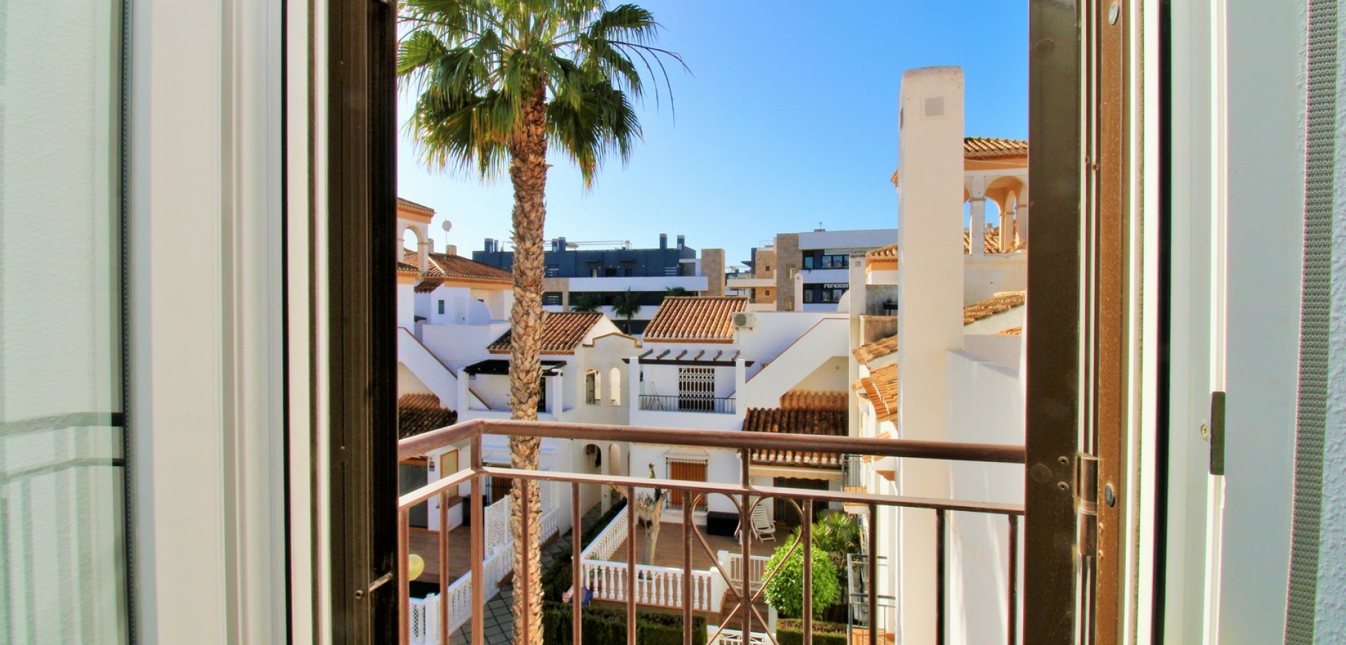 Set in the heart of highly sought-after Playa Flamenca, this beautifully presented duplex penthouse enjoys an exceptional location just under 700 metres from the sandy coves of Cala Estaca and Cala Mosca, and less than 200 metres from all daily amenities, including Mercadona supermarket, bars, restaurants, gym and the local town hall — everything you need is quite literally on your doorstep. Situated within a secure, gated urbanisation, residents benefit from immaculately maintained landscaped gardens and 2 stylish communal swimming pools, creating a peaceful Mediterranean setting despite being so close to the action. The property is designed to maximise outdoor living, offering multiple private terraces with open views of the pool and gardens—ideal for relaxing, dining, or entertaining in the sunshine. Inside, the main living level features a bright open-plan lounge, dining area and kitchen, flooded with natural light and opening directly onto a terrace overlooking the pool. This floor also includes a double bedroom with fitted wardrobes and a modern family bathroom with a walk-in shower, thoughtfully designed to accommodate utilities. The upper level comprises two additional double bedrooms and a second contemporary bathroom, both with walk-in showers. The home includes a private rooftop solarium with a built-in BBQ and beautiful views across the communal areas and the Mediterranean Sea — a perfect spot for evening sunsets or hosting friends. An ideal choice for those seeking a quality home in a prime coastal location, whether as a permanent residence, holiday retreat or investment, with the beaches, amenities and lifestyle of Playa Flamenca all within easy walking distance.