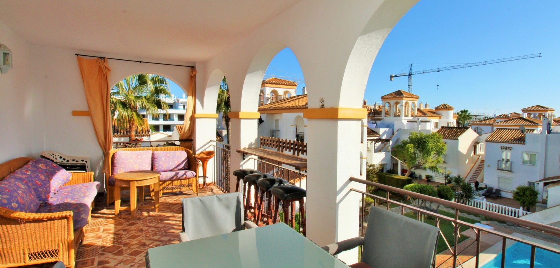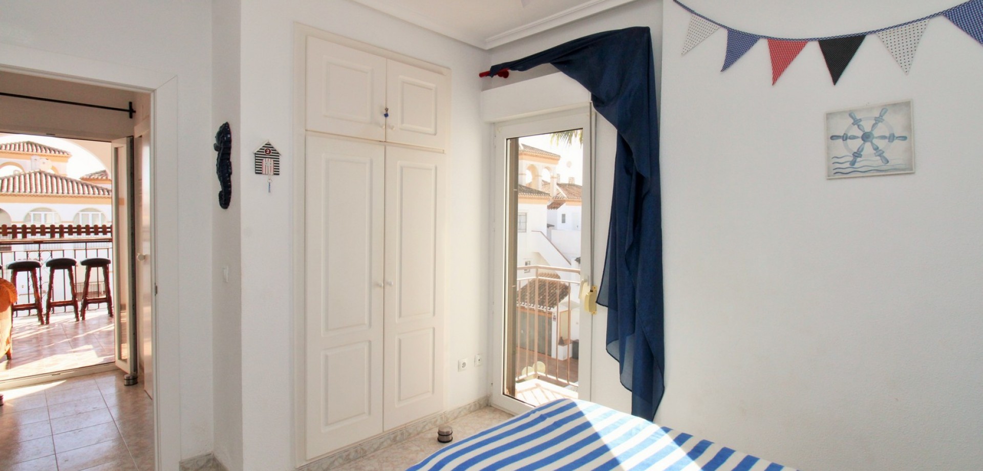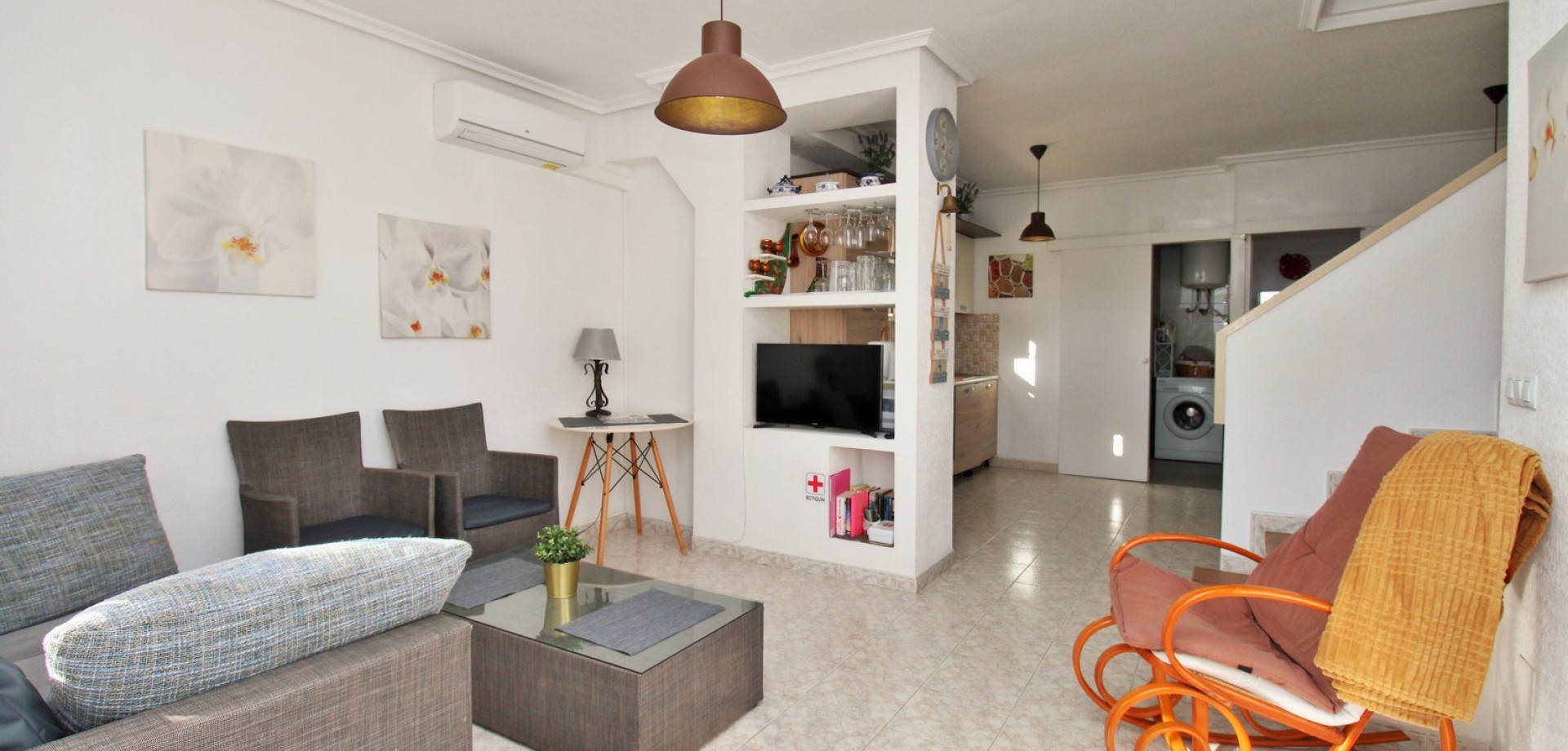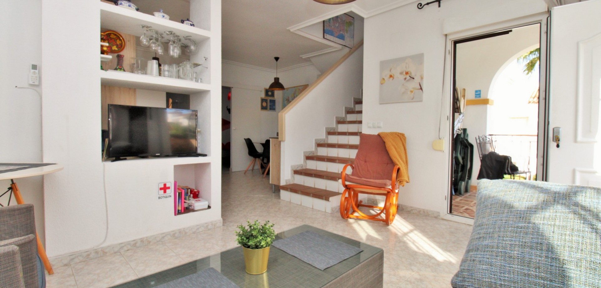 Set in the heart of highly sought-after Playa Flamenca, this beautifully presented duplex penthouse enjoys an exceptional location just under 700 metres from the sandy coves of Cala Estaca and Cala Mosca, and less than 200 metres from all daily amenities, including Mercadona supermarket, bars, restaurants, gym and the local town hall — everything you need is quite literally on your doorstep. Situated within a secure, gated urbanisation, residents benefit from immaculately maintained landscaped gardens and 2 stylish communal swimming pools, creating a peaceful Mediterranean setting despite being so close to the action. The property is designed to maximise outdoor living, offering multiple private terraces with open views of the pool and gardens—ideal for relaxing, dining, or entertaining in the sunshine. Inside, the main living level features a bright open-plan lounge, dining area and kitchen, flooded with natural light and opening directly onto a terrace overlooking the pool. This floor also includes a double bedroom with fitted wardrobes and a modern family bathroom with a walk-in shower, thoughtfully designed to accommodate utilities. The upper level comprises two additional double bedrooms and a second contemporary bathroom, both with walk-in showers. The home includes a private rooftop solarium with a built-in BBQ and beautiful views across the communal areas and the Mediterranean Sea — a perfect spot for evening sunsets or hosting friends. An ideal choice for those seeking a quality home in a prime coastal location, whether as a permanent residence, holiday retreat or investment, with the beaches, amenities and lifestyle of Playa Flamenca all within easy walking distance.