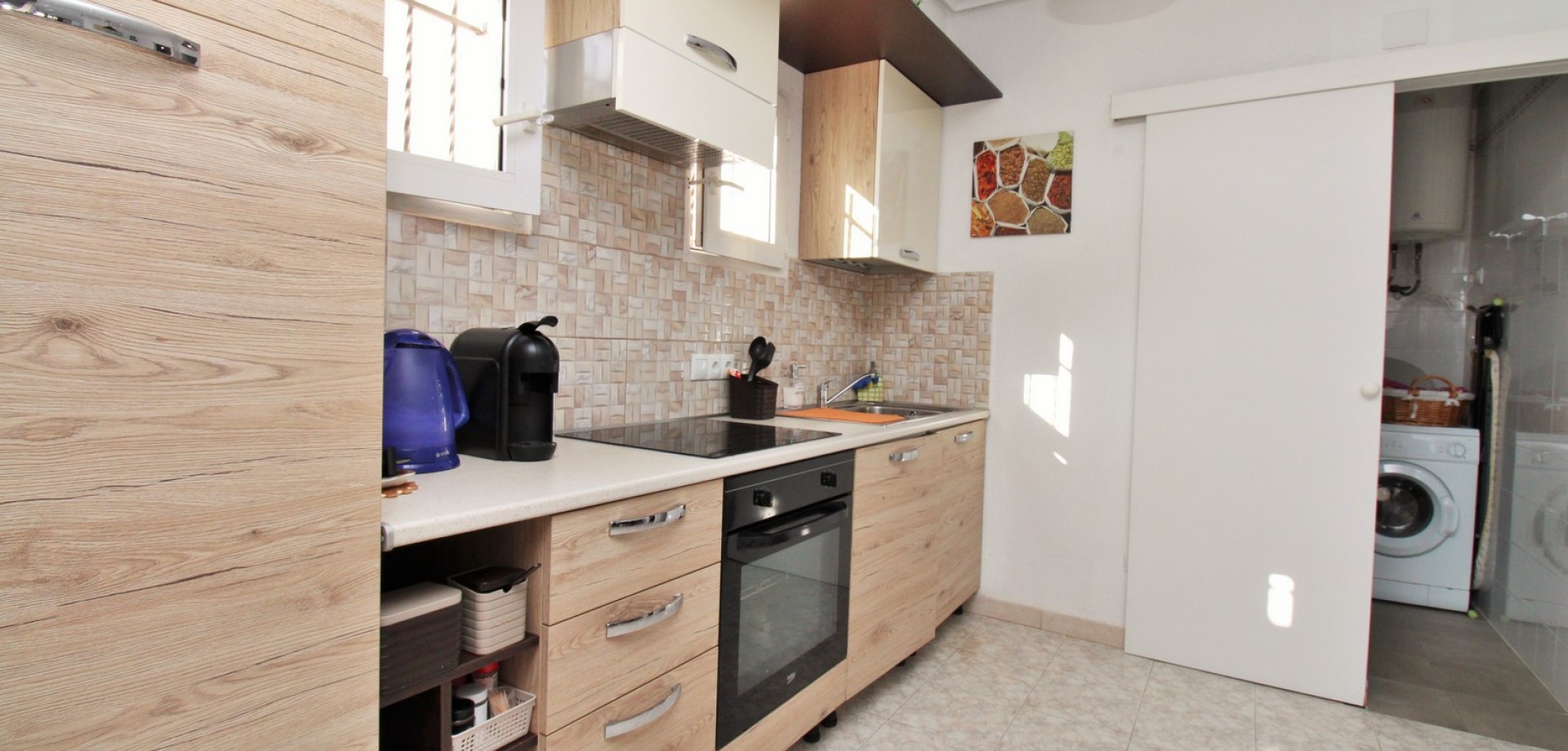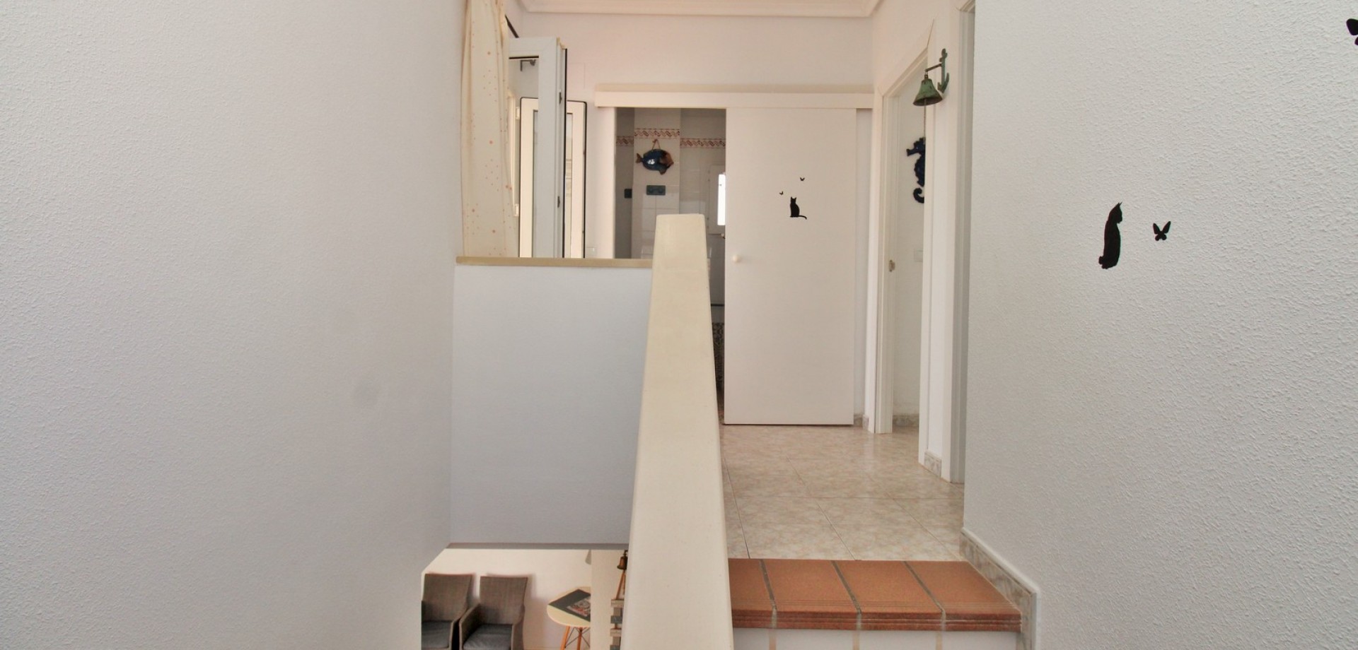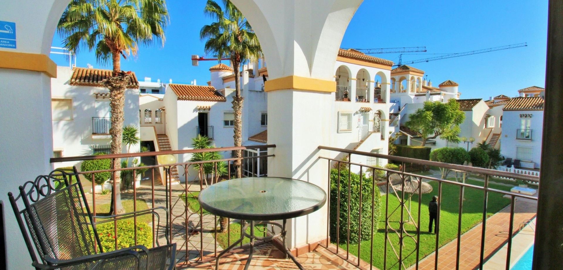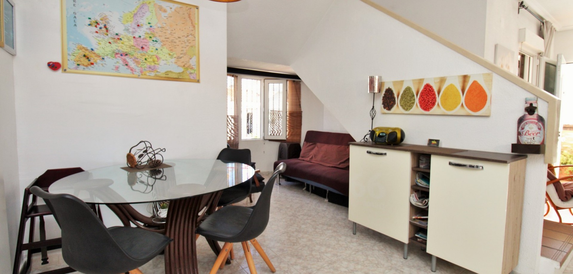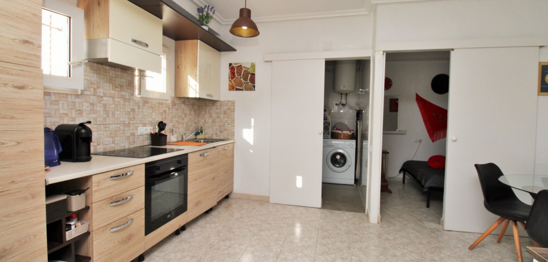 Set in the heart of highly sought-after Playa Flamenca, this beautifully presented duplex penthouse enjoys an exceptional location just under 700 metres from the sandy coves of Cala Estaca and Cala Mosca, and less than 200 metres from all daily amenities, including Mercadona supermarket, bars, restaurants, gym and the local town hall — everything you need is quite literally on your doorstep. Situated within a secure, gated urbanisation, residents benefit from immaculately maintained landscaped gardens and 2 stylish communal swimming pools, creating a peaceful Mediterranean setting despite being so close to the action. The property is designed to maximise outdoor living, offering multiple private terraces with open views of the pool and gardens—ideal for relaxing, dining, or entertaining in the sunshine. Inside, the main living level features a bright open-plan lounge, dining area and kitchen, flooded with natural light and opening directly onto a terrace overlooking the pool. This floor also includes a double bedroom with fitted wardrobes and a modern family bathroom with a walk-in shower, thoughtfully designed to accommodate utilities. The upper level comprises two additional double bedrooms and a second contemporary bathroom, both with walk-in showers. The home includes a private rooftop solarium with a built-in BBQ and beautiful views across the communal areas and the Mediterranean Sea — a perfect spot for evening sunsets or hosting friends. An ideal choice for those seeking a quality home in a prime coastal location, whether as a permanent residence, holiday retreat or investment, with the beaches, amenities and lifestyle of Playa Flamenca all within easy walking distance.