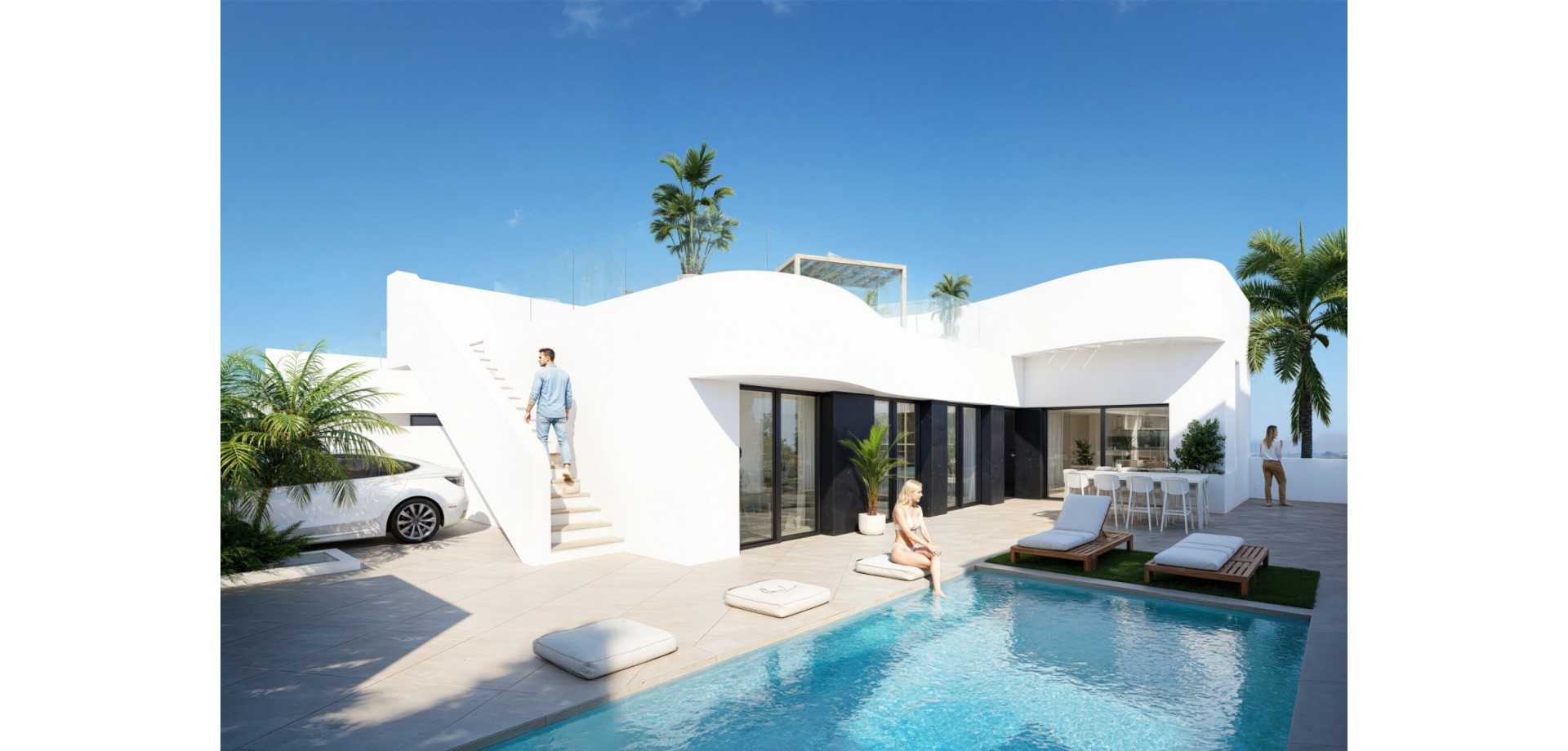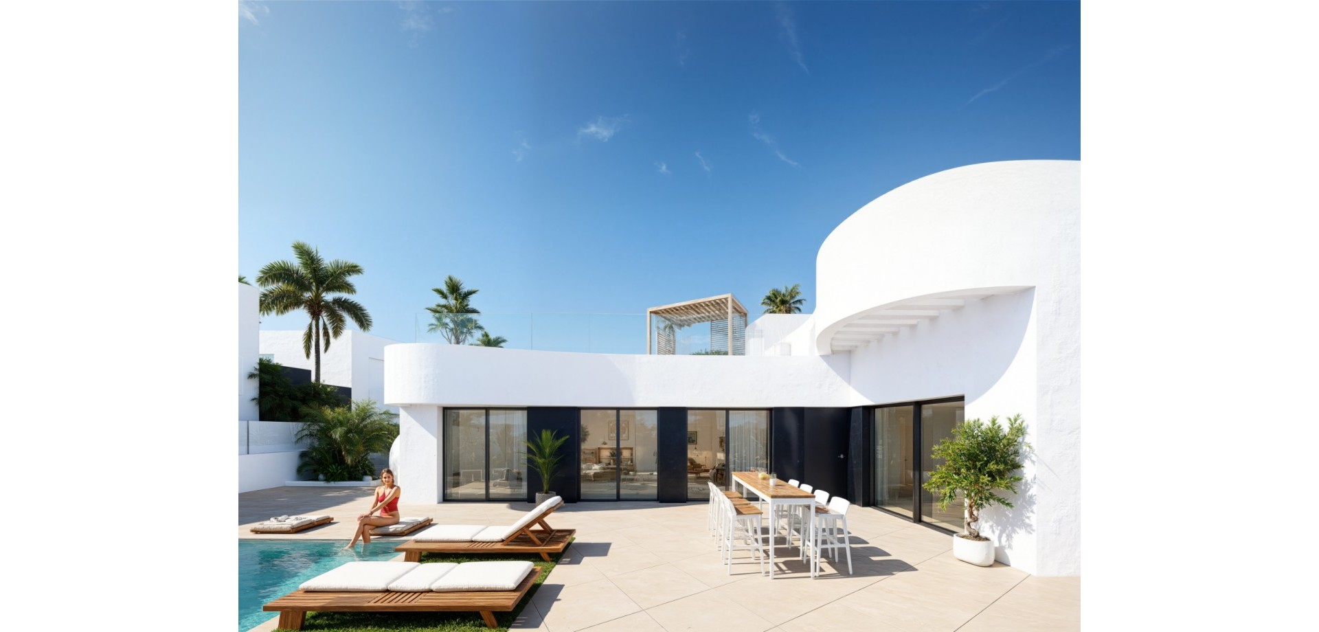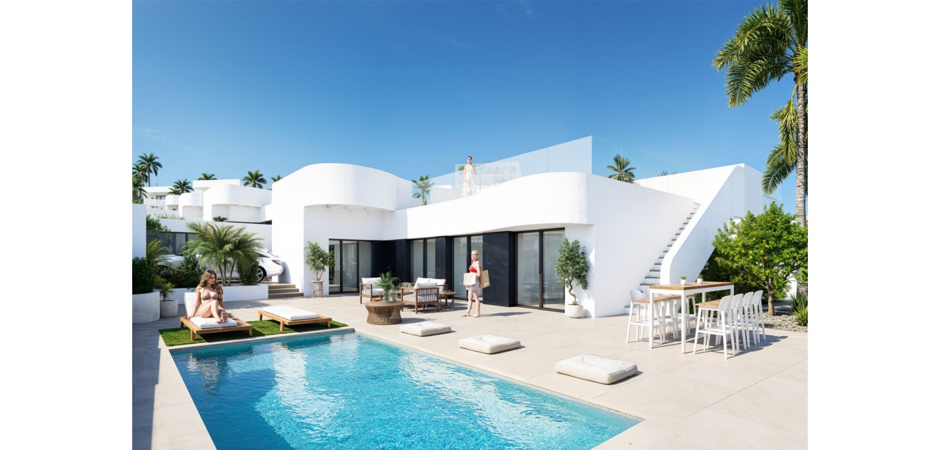 Each villa is designed in an elegant Ibiza-style, featuring soft curved lines, bright white façades and spacious outdoor areas ideal for year-round living. Every home includes a private swimming pool, on-plot parking, and generous terraces perfect for relaxing or entertaining in the golf resort setting.