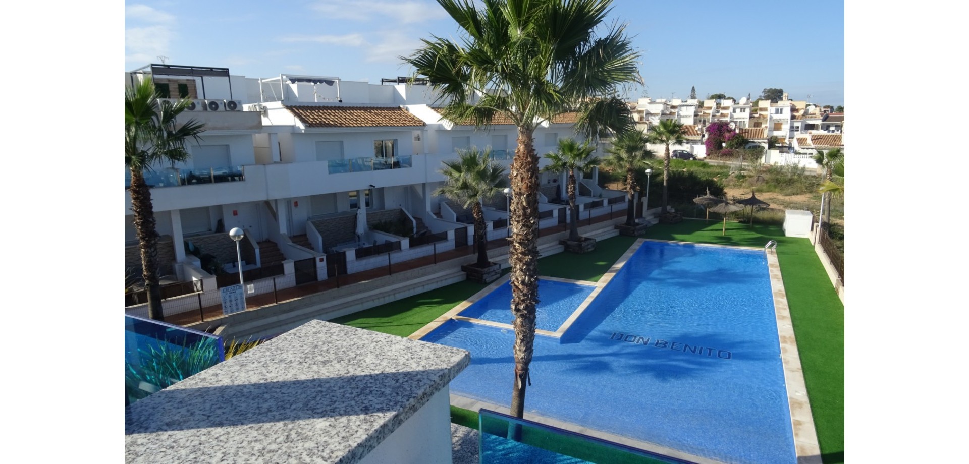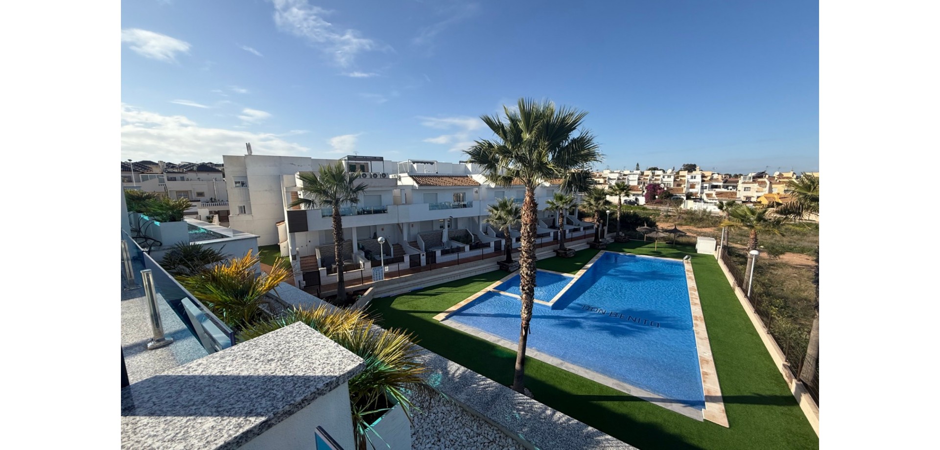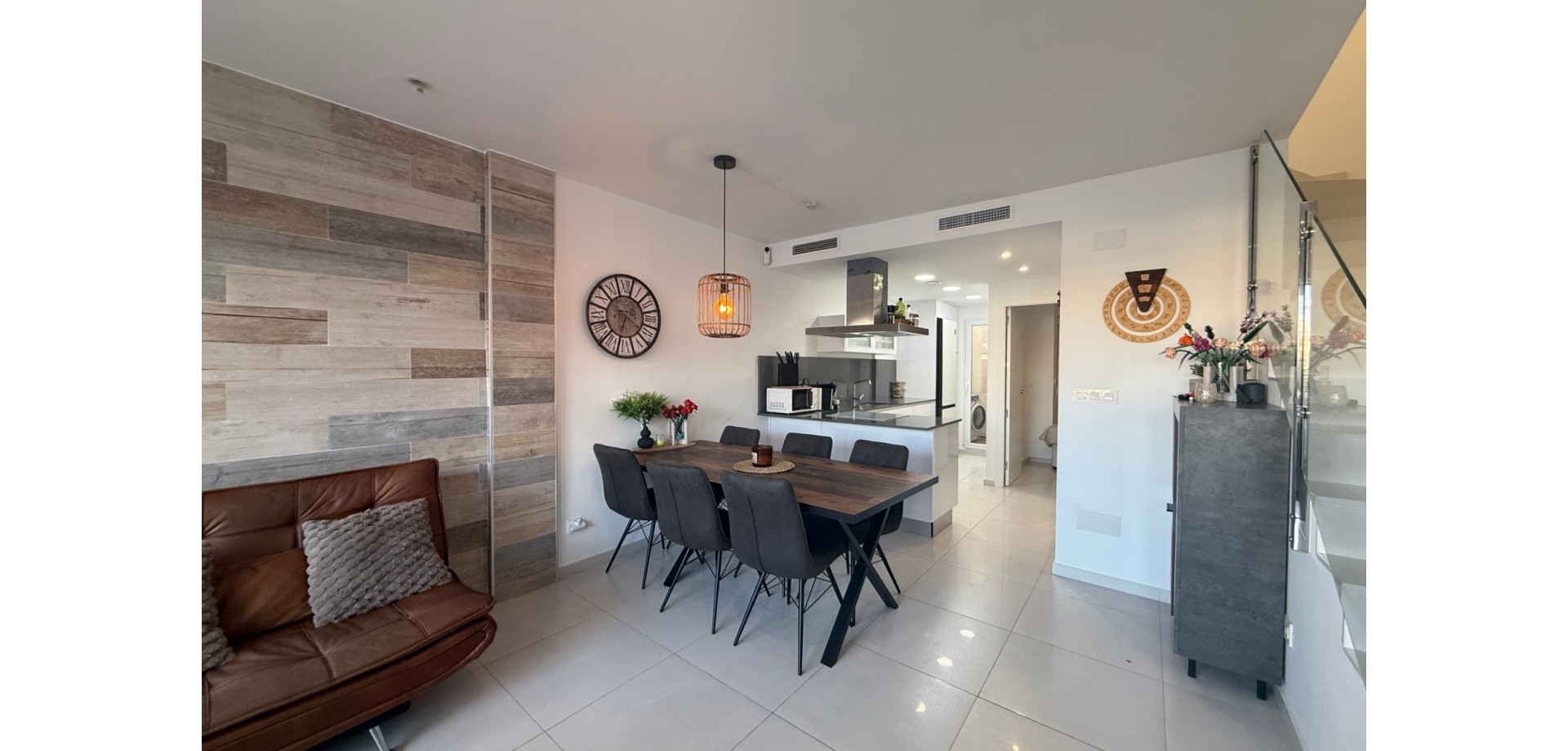 A stylish and well-designed townhouse in Los Balcones on the Costa Blanca, sold fully furnished. The property is arranged over two floors and offers three spacious bedrooms, three fully equipped bathrooms, and a bright open-plan kitchen connected to a cozy living area. There is access to a terrace as well as a rooftop solarium where you can enjoy the sun and views. The complex features a well-maintained communal swimming pool, and the property includes a designated parking space. Los Balcones is a popular residential area on the Costa Blanca, located just south of Torrevieja, known for its peaceful atmosphere, excellent services, and great location. The area offers a wide range of shops, restaurants, cafés, pharmacies, and other everyday services within walking distance, as well as close proximity to schools and healthcare. Nature lovers will appreciate the nearby Torrevieja salt lakes, famous for their scenic walking paths. Los Balcones is only a short drive from Mediterranean beaches, golf courses, and the center of Torrevieja, with good transport connections and easy access to Alicante Airport. Contact us for more information about this wonderful property!