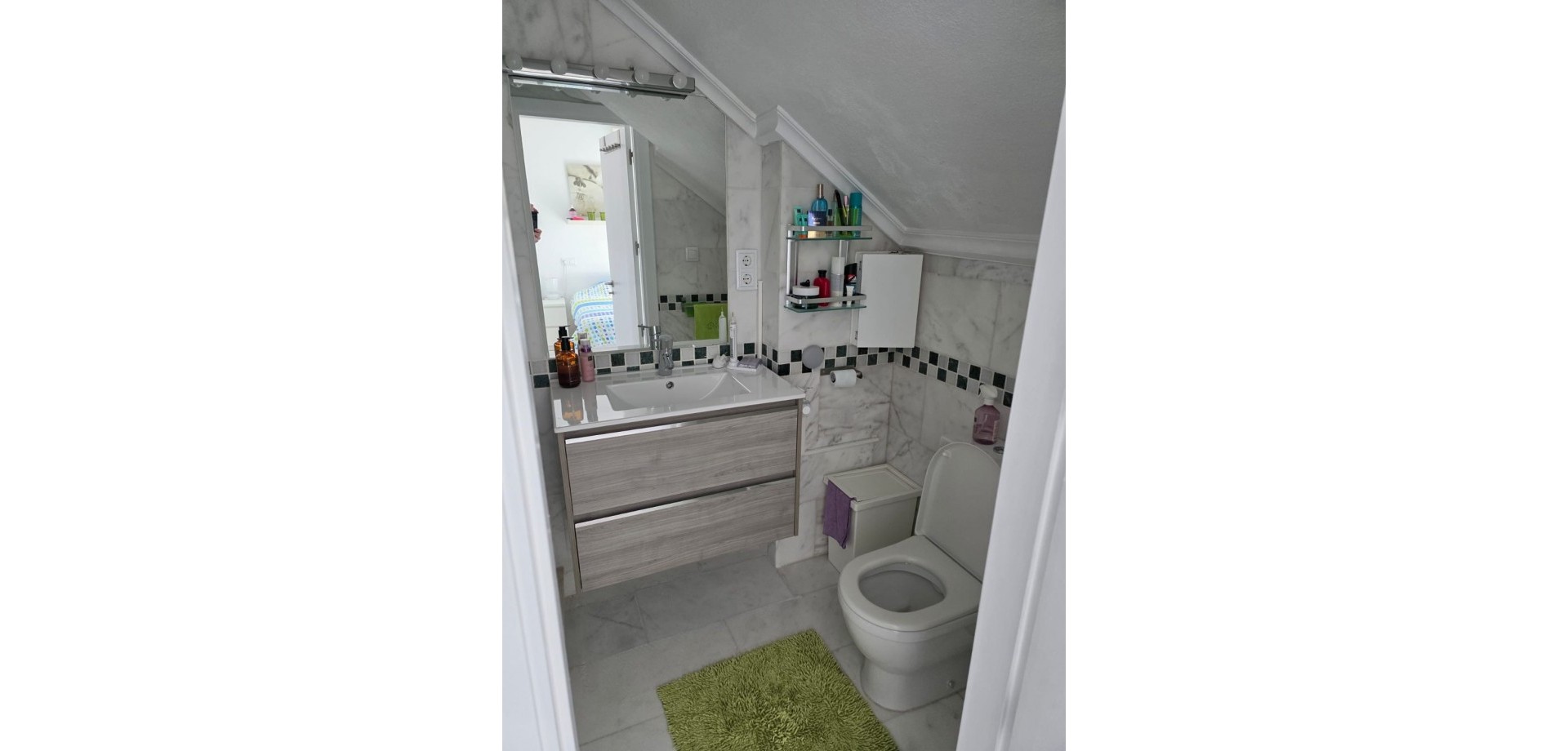 The apartment offers a well-designed layout with two spacious bedrooms and two bathrooms. The master bedroom includes an en-suite shower room, while a second family bathroom serves the rest of the property.