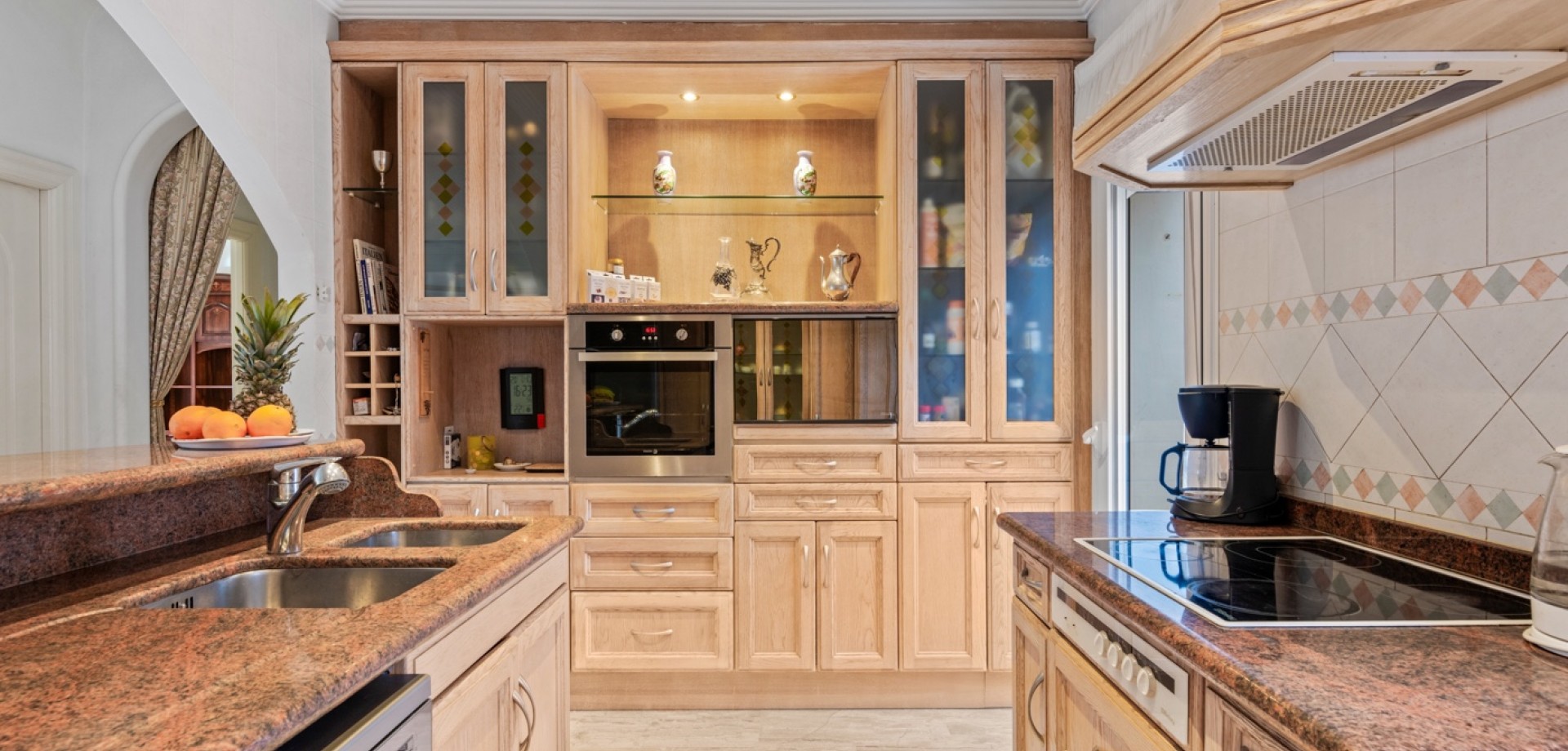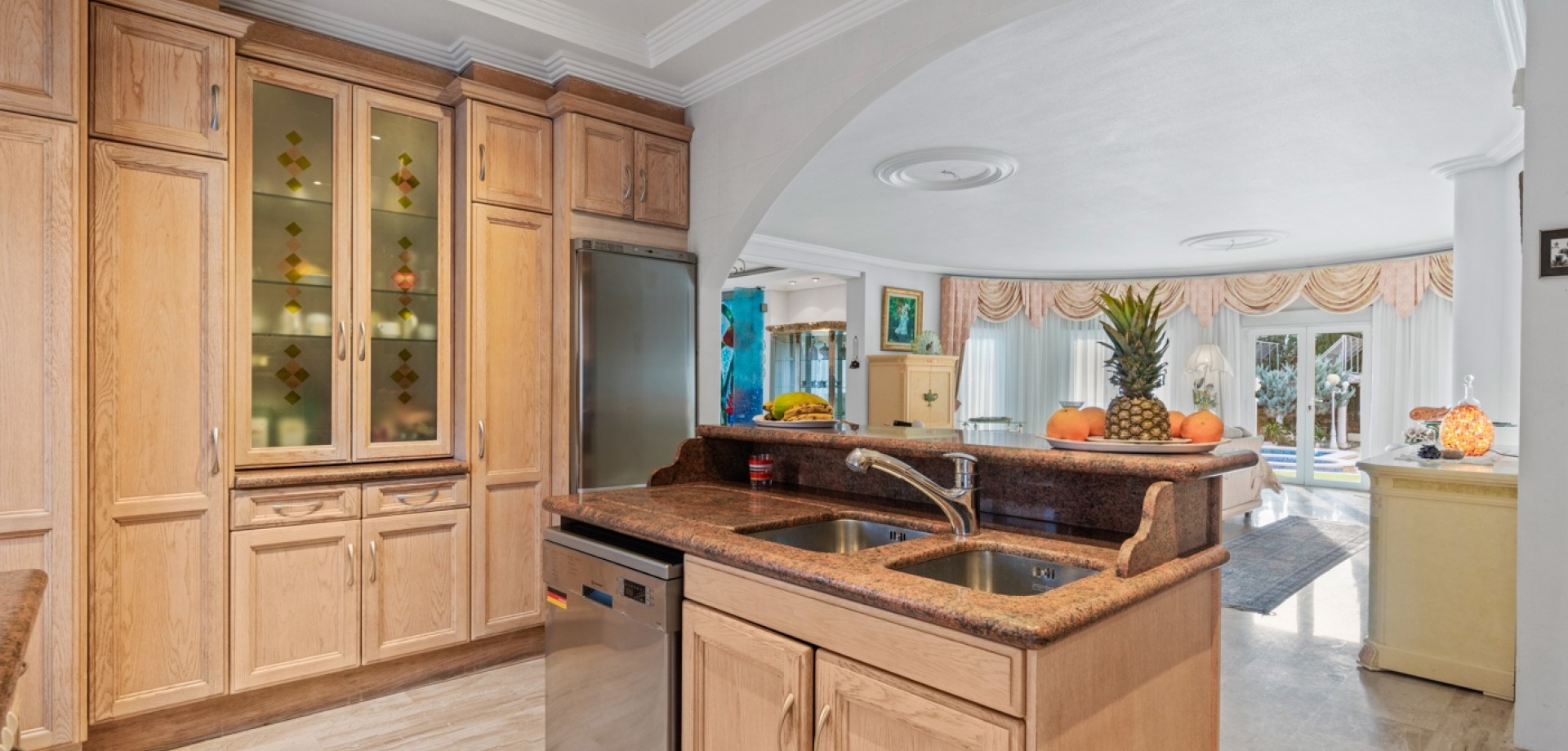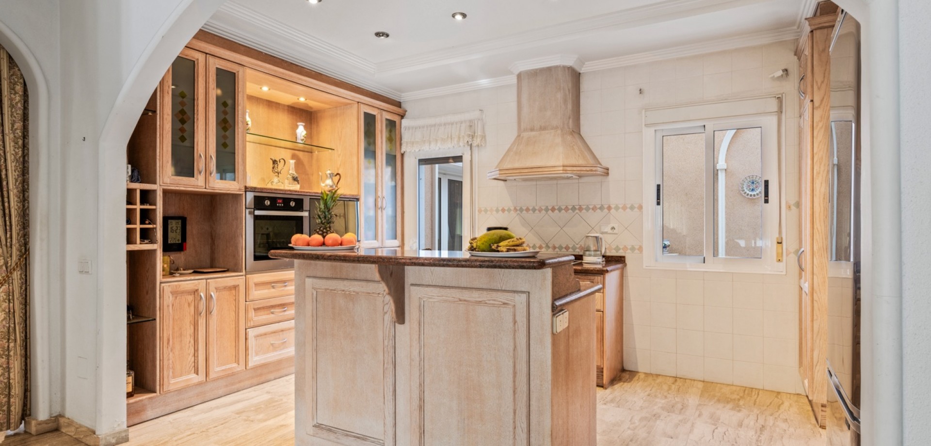 The exterior of the property is one of its greatest attractions: it features a fully equipped, enclosed outdoor kitchen, ready for year-round use, as well as a large swimming pool, ideal for family and social gatherings. The plot also includes a closed garage, additional parking space, and landscaped gardens that completely surround the house.
