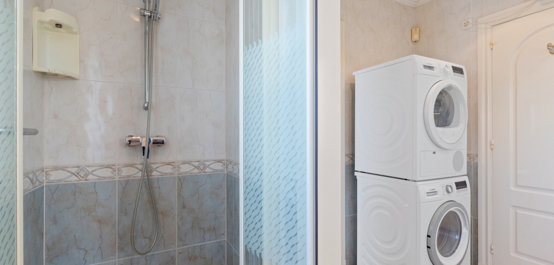 On the upper floor is a spectacular master suite, which features a bathtub and private shower, as well as access to two separate terraces. On this floor, we also find two additional bedrooms, a full bathroom, and a shared terrace.