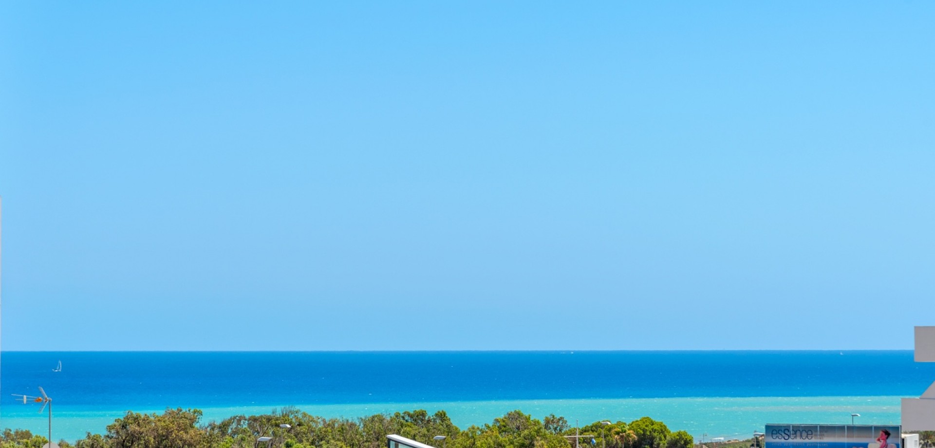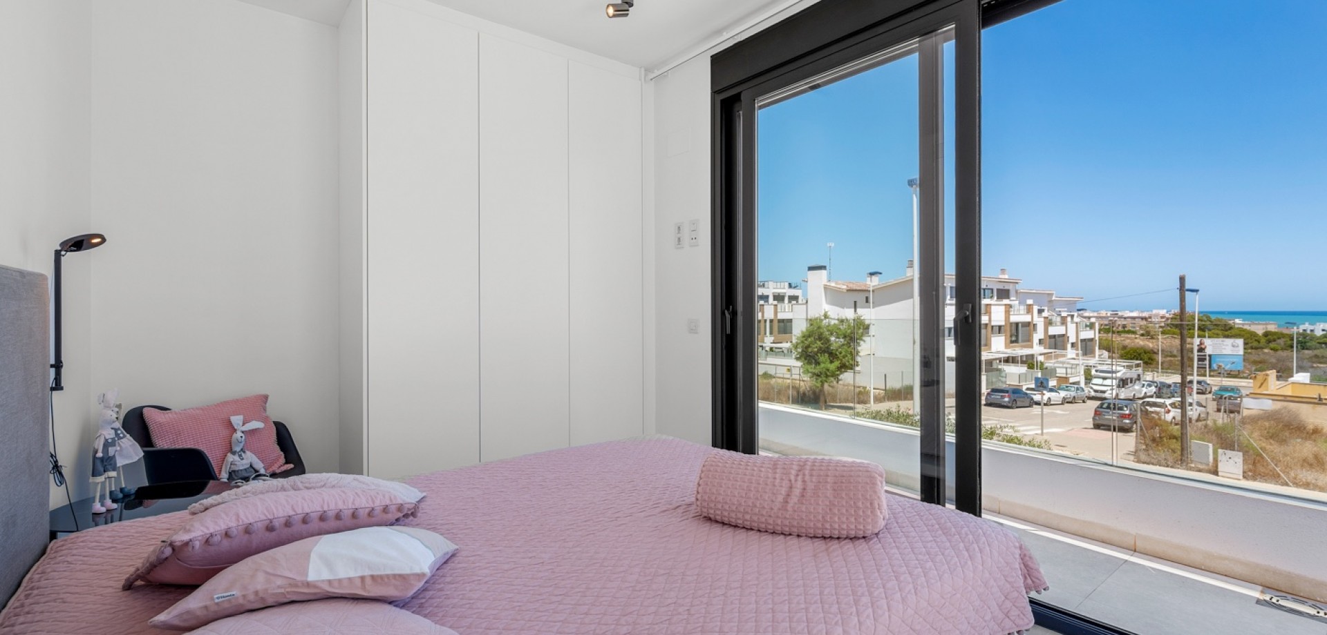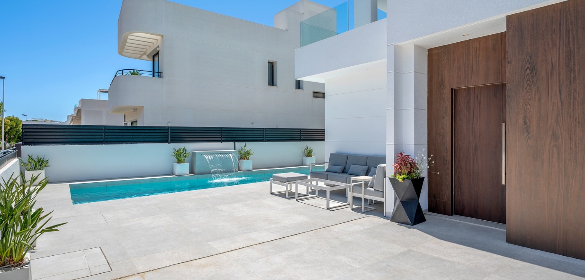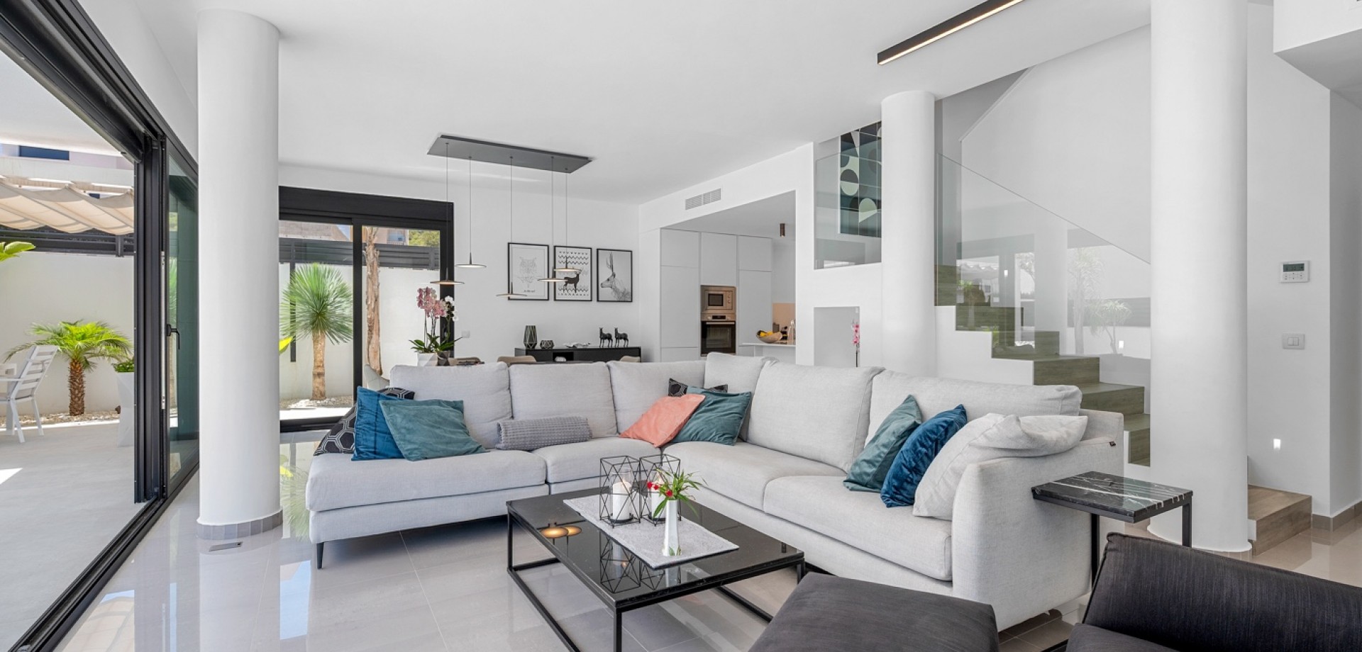 Situated on a 347m² plot, this contemporary villa—built in 2019—offers a refined blend of modern architecture and comfortable living. Spanning 194m² across three levels, the home features four generously sized bedrooms and three bathrooms, with a layout designed for both privacy and functionality. The open-plan kitchen flows into the dining and living areas, creating a bright, spacious environment with direct access to the garden and terrace through large sliding glass doors, inviting natural light throughout the day. The main entrance is positioned on the north side of the property, while the garden and pool area enjoy a sunny south-facing orientation. Outside, the 36m² private swimming pool serves as a focal point, surrounded by clean, modern landscaping and a selection of lounging and dining areas. A pergola provides a shaded retreat for outdoor meals, and a covered terrace extends the living space outdoors. The rooftop solarium offers open views and a relaxing spot to enjoy the surrounding environment, including partial sea views. Upstairs, the primary suite includes a walk-in closet and access to a private balcony, while two additional bedrooms with built-in wardrobes complete the upper level. A fourth bedroom is located on the ground floor, ideal for guests or flexible use. Additional conveniences include a separate laundry room, a storage area, and private parking on the plot. With its thoughtful layout, quality finishes, and excellent orientation, this home presents a modern lifestyle just minutes from the sea.