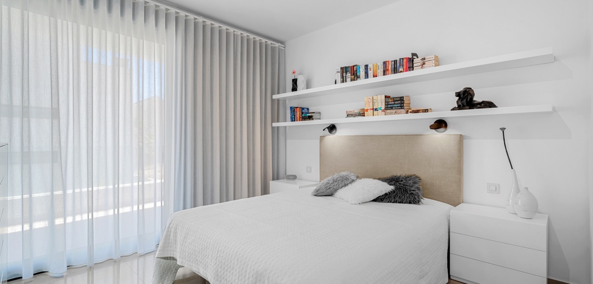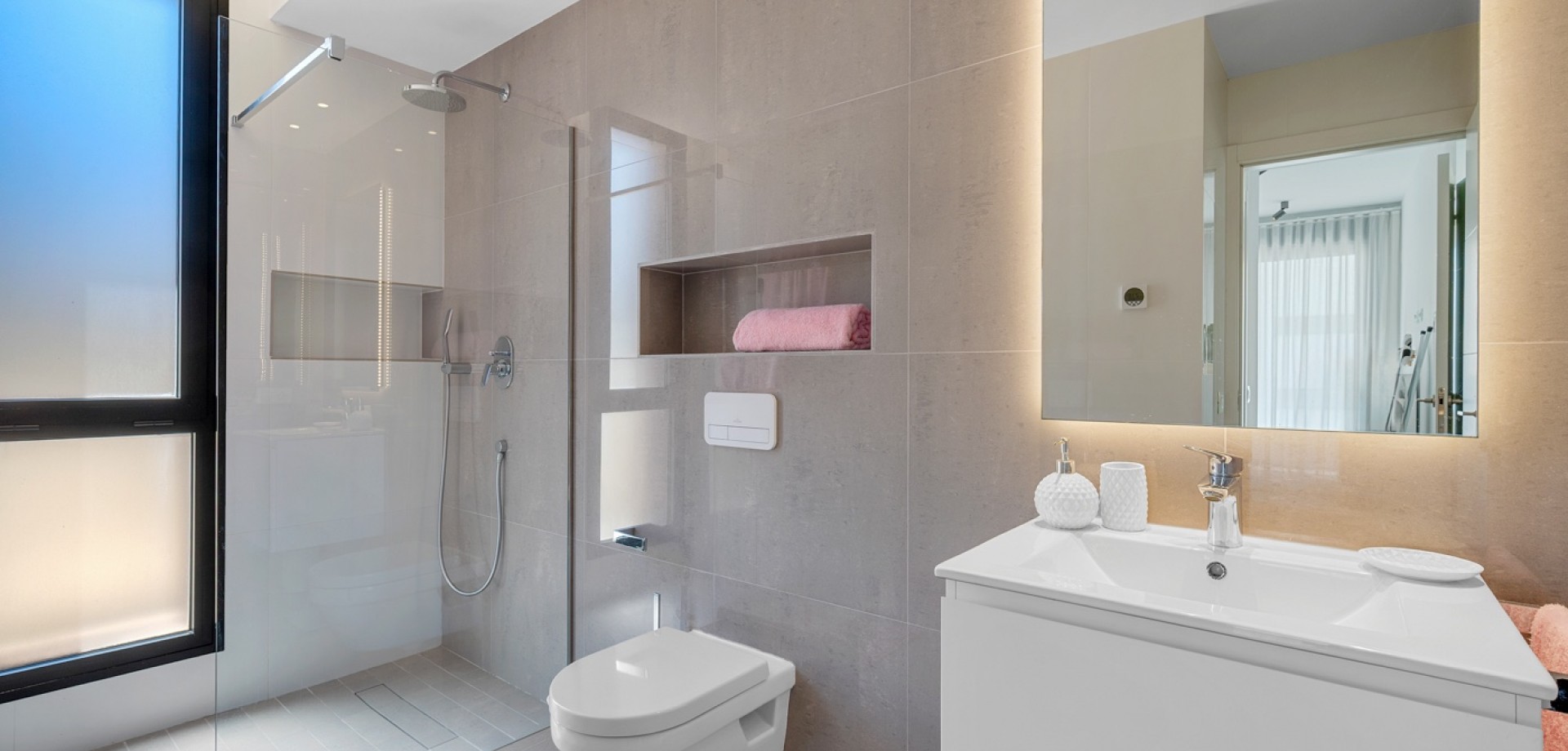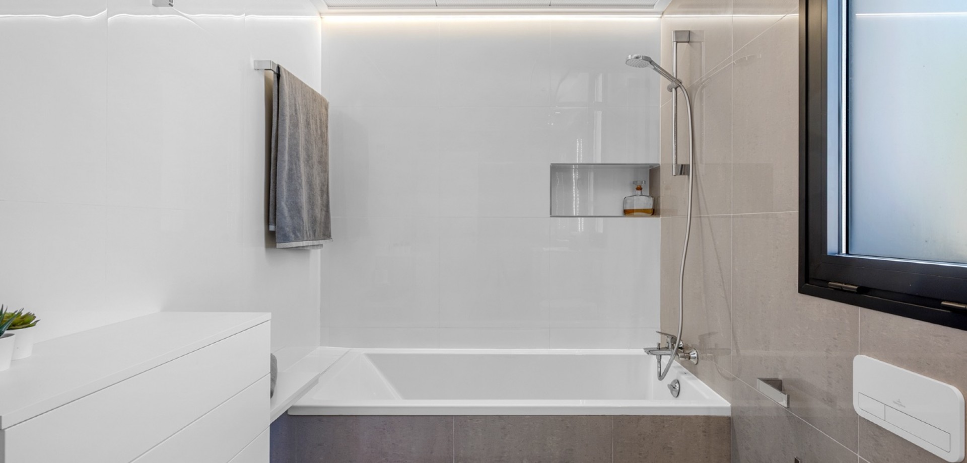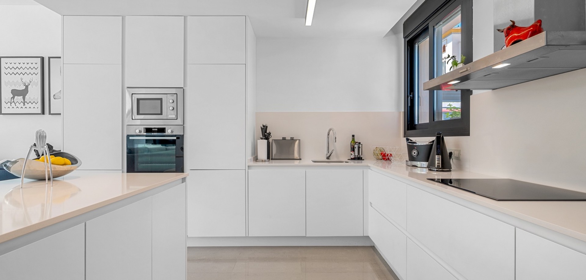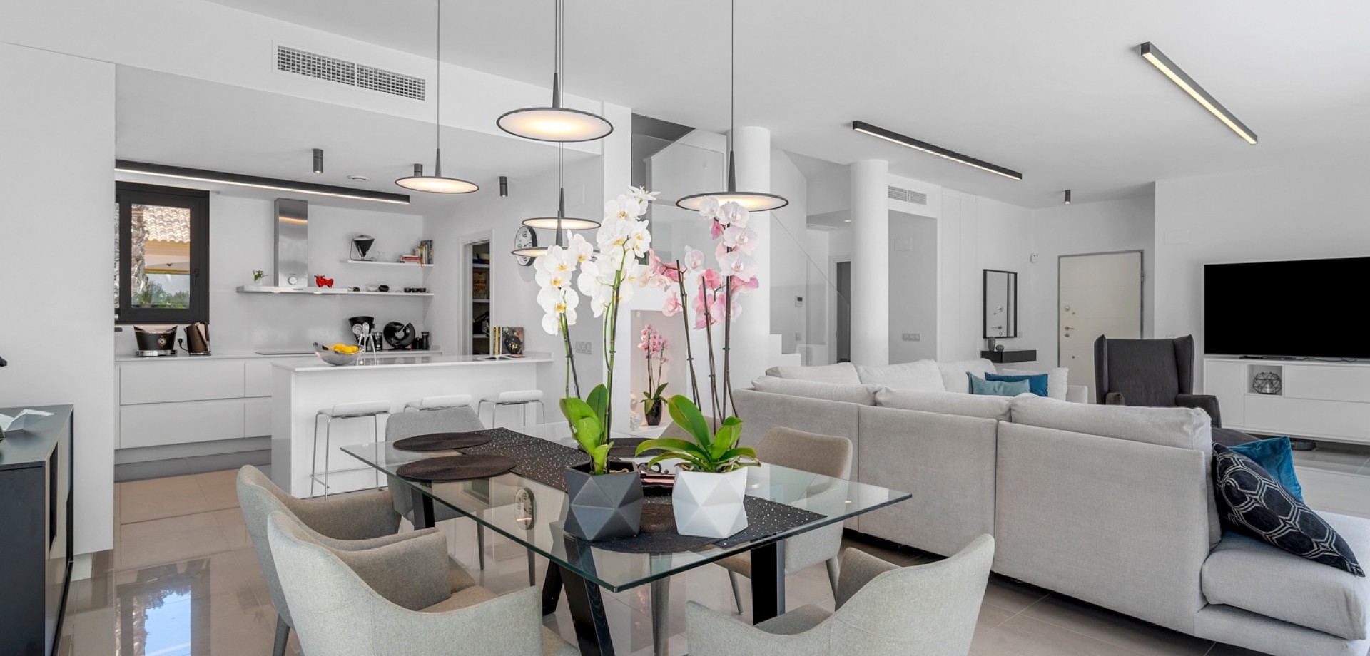Situated on a 347m² plot, this contemporary villa—built in 2019—offers a refined blend of modern architecture and comfortable living. Spanning 194m² across three levels, the home features four generously sized bedrooms and three bathrooms, with a layout designed for both privacy and functionality. The open-plan kitchen flows into the dining and living areas, creating a bright, spacious environment with direct access to the garden and terrace through large sliding glass doors, inviting natural light throughout the day. The main entrance is positioned on the north side of the property, while the garden and pool area enjoy a sunny south-facing orientation. Outside, the 36m² private swimming pool serves as a focal point, surrounded by clean, modern landscaping and a selection of lounging and dining areas. A pergola provides a shaded retreat for outdoor meals, and a covered terrace extends the living space outdoors. The rooftop solarium offers open views and a relaxing spot to enjoy the surrounding environment, including partial sea views. Upstairs, the primary suite includes a walk-in closet and access to a private balcony, while two additional bedrooms with built-in wardrobes complete the upper level. A fourth bedroom is located on the ground floor, ideal for guests or flexible use. Additional conveniences include a separate laundry room, a storage area, and private parking on the plot. With its thoughtful layout, quality finishes, and excellent orientation, this home presents a modern lifestyle just minutes from the sea.