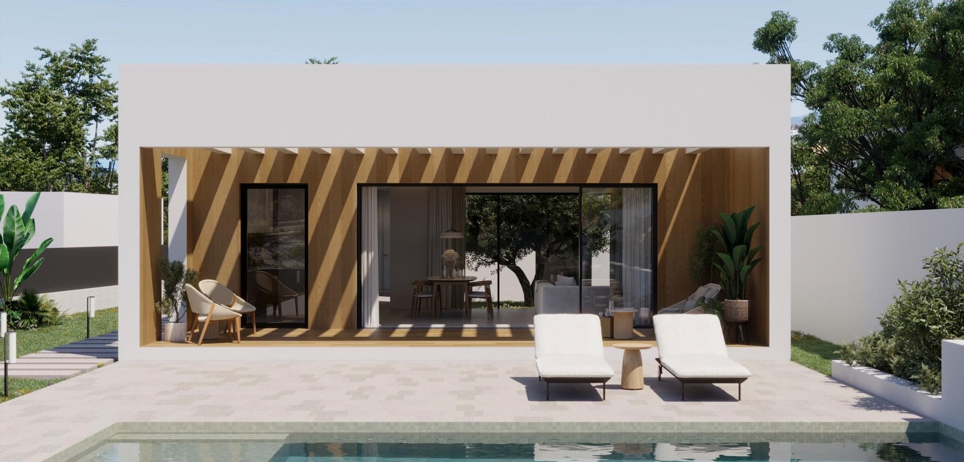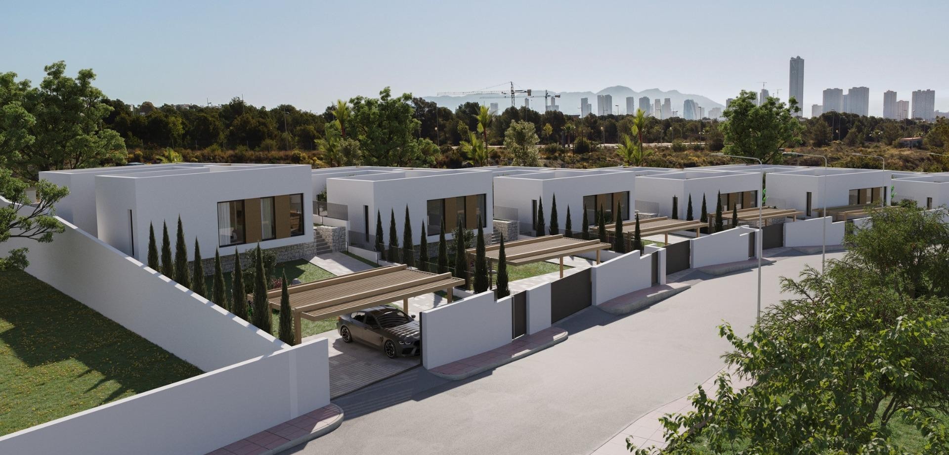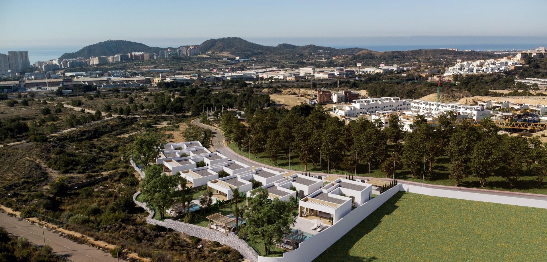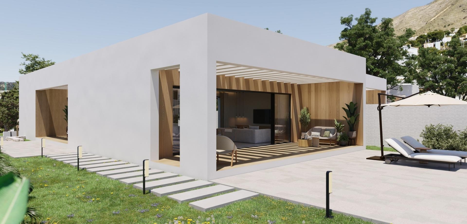 Modern Single-Storey Villas with Private Pool in Finestrat – Tranquility Meets Coastal Living Exclusive New Build Villas on Spacious Plots Discover an exclusive collection of 7 new build villas in Finestrat, each thoughtfully designed on a single floor with 3 bedrooms, 2 bathrooms, and 1 guest toilet. Set on generous plots of over 600 m², these properties offer an ideal blend of space, privacy, and elegance. Surrounded by lush Mediterranean landscaping and mountain views, these homes deliver a serene lifestyle just minutes from the vibrant coast of Benidorm. Elegant Design and Premium Outdoor Spaces Every villa is conceived as a peaceful oasis, featuring modern architecture and natural elements. The entrance welcomes you with a wide, elegant driveway and a covered carport. A landscaped garden filled with native plants and blooming trees sets the tone for a tranquil lifestyle. At the center of the home, a private courtyard adds charm and natural light, while the expansive garden includes a beautiful private pool surrounded by greenery and sunbathing areas. This outdoor sanctuary is perfect for entertaining or simply relaxing under the Mediterranean sun. High-Quality Finishes and Comfort These villas are built to high standards, with premium finishes and thoughtful features including: Double-glazed aluminium windows with thermal break for energy efficiency Fully equipped bathrooms with furniture, mirrors, and walk-in showers with screens Pre-installation for ducted air conditioning for year-round climate control Motorized vehicle access gate Private pool and landscaped garden Elegant modern kitchen and open-plan living space filled with natural light Prime Location in Finestrat, Close to Benidorm and the Coast Located in the picturesque town of Finestrat, these villas enjoy excellent connectivity to services and amenities: Beaches of Benidorm: less than 3 km La Marina Shopping Centre: 1 km Puig Campana Golf: 3 km Benidorm Old Town and entertainment area: 4 km Alicante International Airport: 55 km (approx. 40 minutes by car) Easy access to the A7 motorway for fast travel to Alicante, Valencia, and beyond This location offers the peace of a natural setting with quick access to shops, restaurants, golf courses, and the Mediterranean coast. Experience luxury, comfort, and nature in perfect harmony. Contact us now to schedule a visit or request more information about these unique villas in Finestrat.