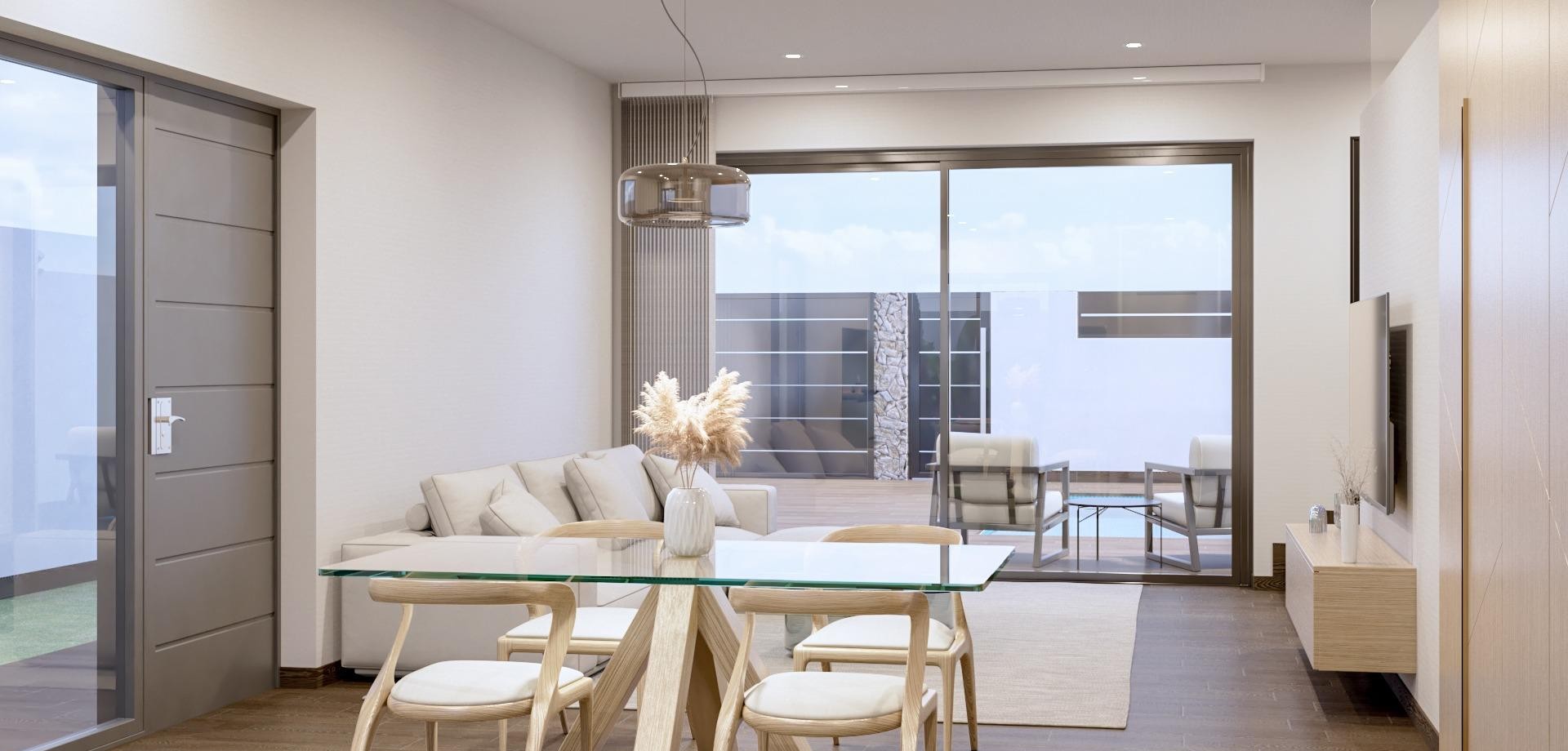 Luxury Villas in San Pedro del Pinatar - Modern Living in a Prime Location Overview of Stunning New-Build Villas Discover the epitome of luxury living in San Pedro del Pinatar with these exceptional new-build villas. Each villa is thoughtfully designed with meticulous attention to detail, offering spacious and sunlit interiors that blend style with comfort. These villas feature an open-plan living room, dining area, and kitchen, creating a seamless flow throughout the main living space. With 3 bedrooms, including a master suite complete with a walk-in closet and ensuite bathroom, these homes are perfect for those seeking both elegance and functionality. Private Outdoor Spaces and High-End Amenities Each villa is set on a private plot of approximately 200 square meters, providing ample space for outdoor living and relaxation. The property includes a private pool, perfect for enjoying warm Mediterranean days, and a designated parking area. An expansive private solarium offers a beautiful space for sunbathing, entertaining, or simply enjoying the peaceful surroundings. These villas offer a high-quality lifestyle with premium amenities and modern comforts in one of Spain’s most desirable coastal areas. Prime Location in San Pedro del Pinatar San Pedro del Pinatar is known for its beautiful beaches, vibrant community, and close proximity to essential services and leisure activities. Located just 900 m from the beach and water sports facilities, these villas allow residents to enjoy all the natural beauty and recreational opportunities of the Mar Menor coast. The villas are also conveniently close to a wide range of local amenities, including shops, restaurants, and bars. Larger shopping centers are just a short drive away, providing residents with easy access to a variety of retail options. Close Proximity to Key Points of Interest Murcia-Corvera Airport: Approximately 30 km away, offering convenient international and domestic travel options. Alicante Airport: Just an hour's drive (around 85 km), providing access to numerous global destinations. Several Golf courses like Lo Romero, Roda Golf or La Serena within a short drive, perfect for golf enthusiasts. Shopping Centers: A 10-minute drive to Dos Mares Shopping Center, offering various retail stores, restaurants, and entertainment options. Beaches of Mar Menor: Just 900 m from the villas, these sandy shores are ideal for relaxation, swimming, and water activities. Experience the Charm of San Pedro del Pinatar San Pedro del Pinatar offers the charm of a traditional Spanish coastal town while providing all modern conveniences. Its strategic location near the Mar Menor and Costa Cálida ensures easy access to beautiful beaches, high-quality amenities, and a vibrant local culture, making it the ideal place to call home.
