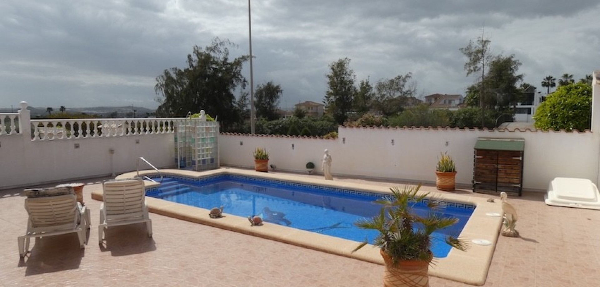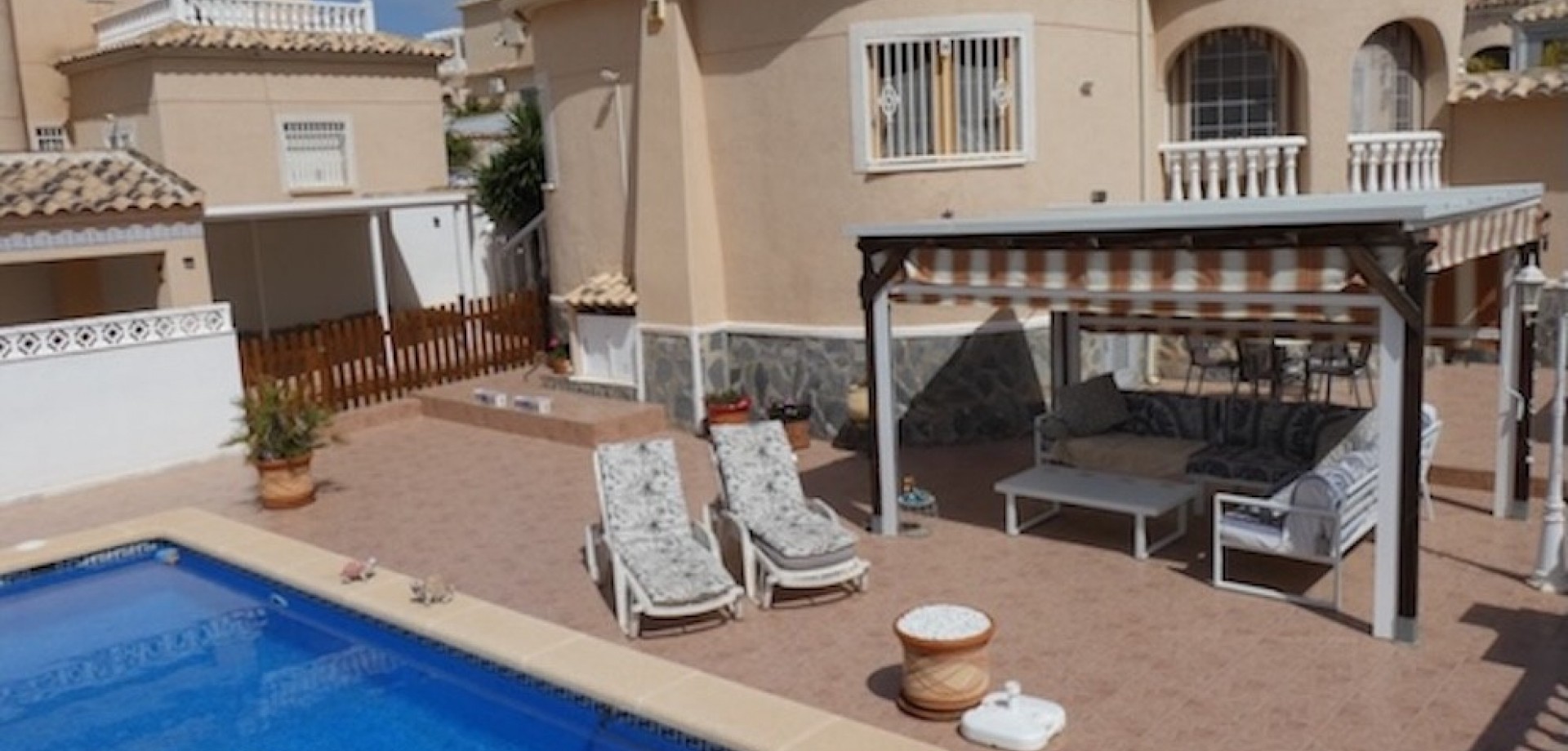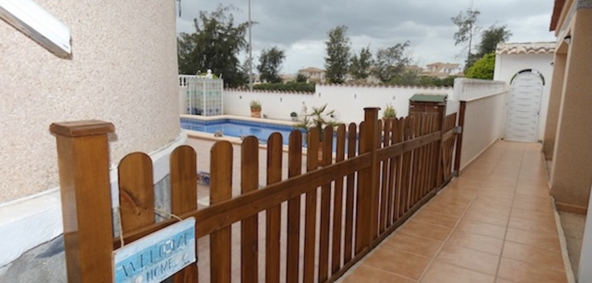 p The property sits on a plot of 522m2 and has living space of 111m2. Entering the property either through the driveway which has a covered car-port or the pedestrian entrance, the villa opens up totally with views of the pool area, immediate once arriving inside the plot. The swimming pool area is totally tiled with plenty of space to sit and enjoy the sun or even to lie down and catch some rays. There is a shower, BBQ, seating area and has been fenced off by the current owner, as protection for children and also pets getting into that area. From the pool area, towards the side of the property, is another seating area which leads onto the terrace. The terrace has protection against the weather, allowing it to be a place to be able to sit, when it is hot but also during the cooler months. To the back of the property and to the other side, it has a selection of plants and tree´s and laid mainly to gravel. /p